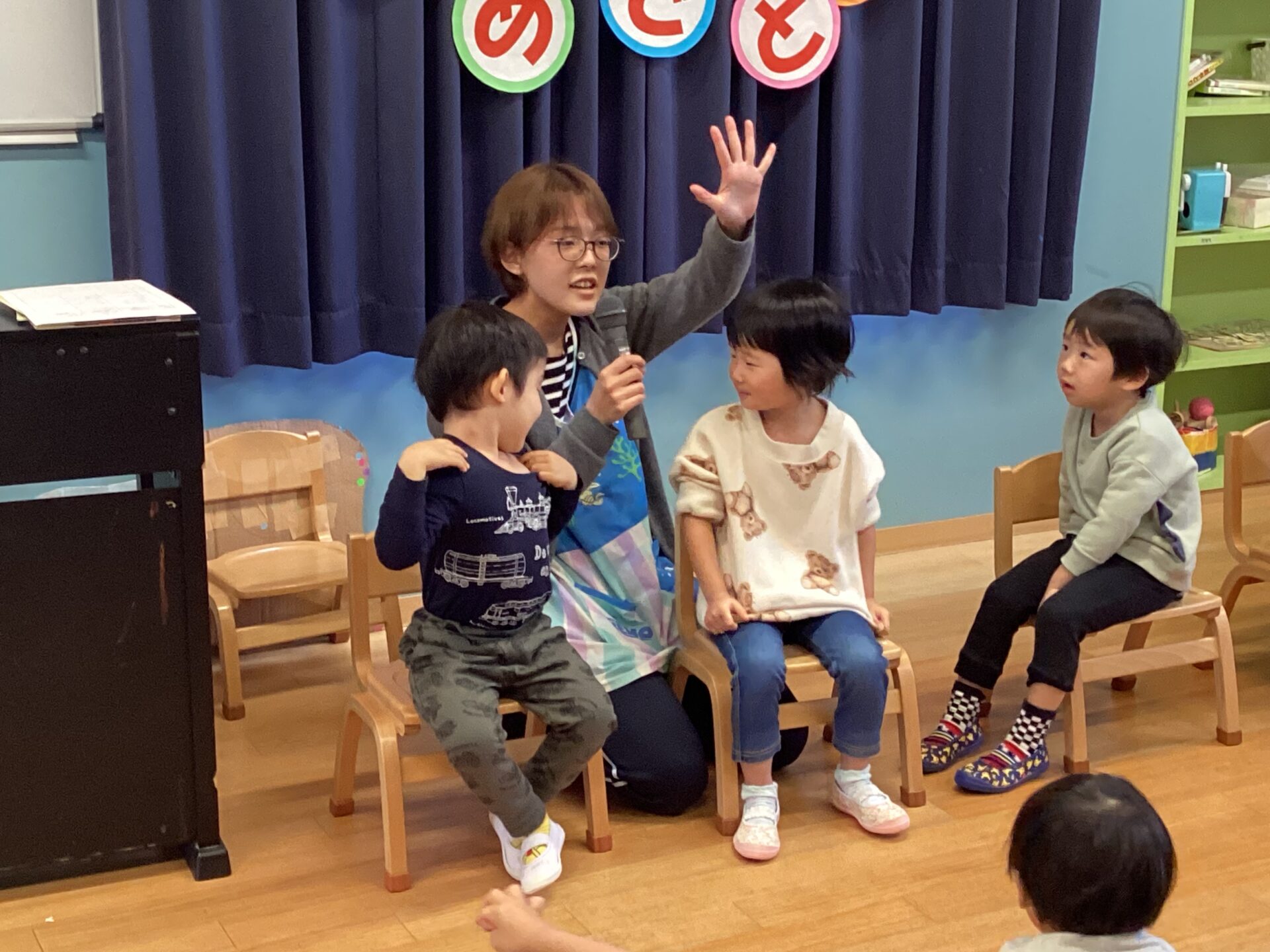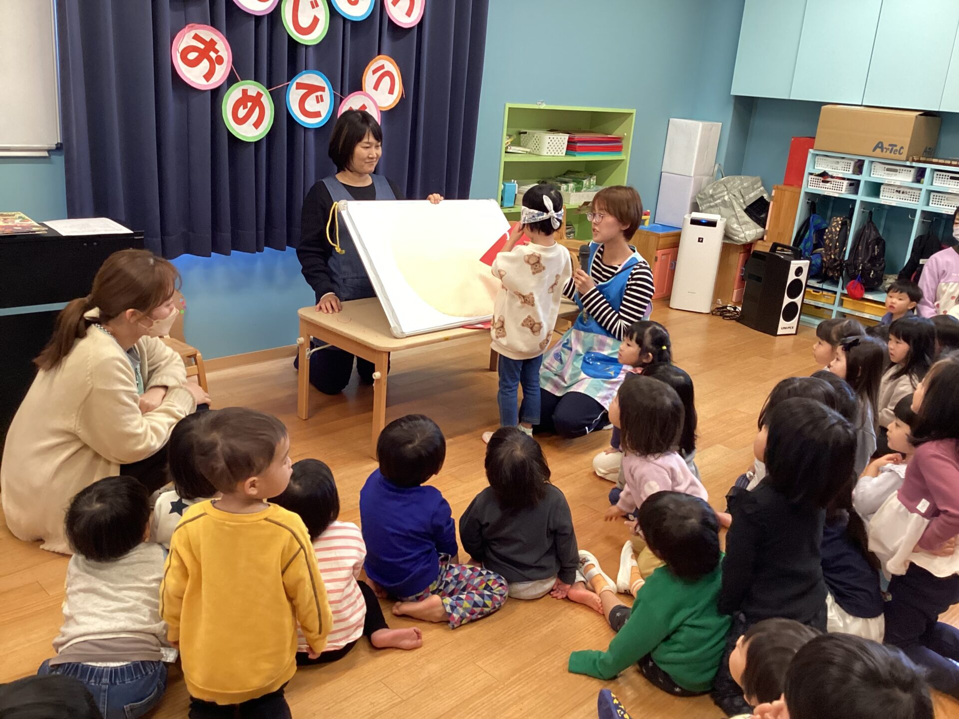 1月の誕生会をしました。一番小さな0歳うみチームのお友達が1人お休みだったので、5人のお友達をお祝いしました。