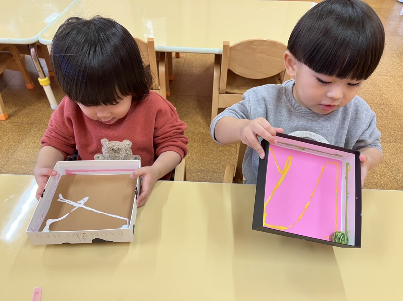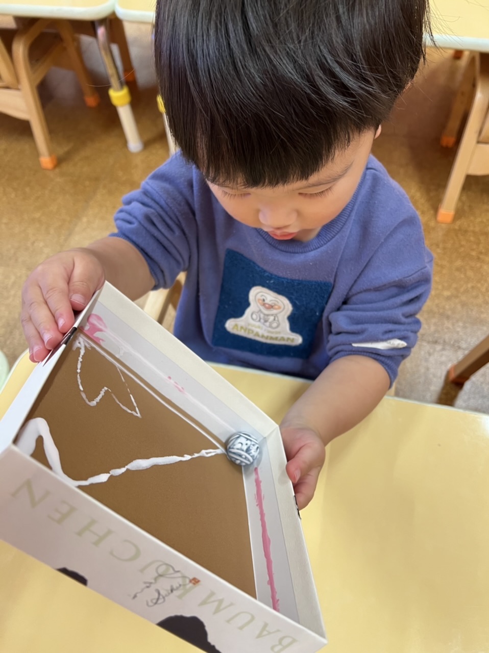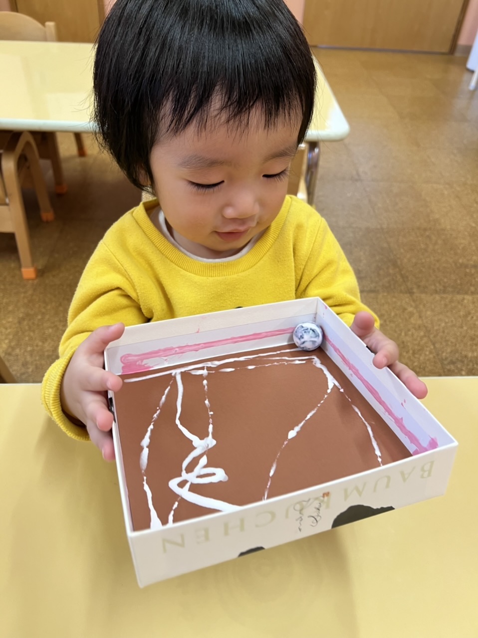 子どもたちは、透明のキラキラしたビー玉に釘付けで、箱を一生懸命動かしていました。ビー玉が、コロコロ転がって、綺麗な模様が描かれていきます。楽しくなりすぎて、ビー玉が飛んでいきそうなほど。