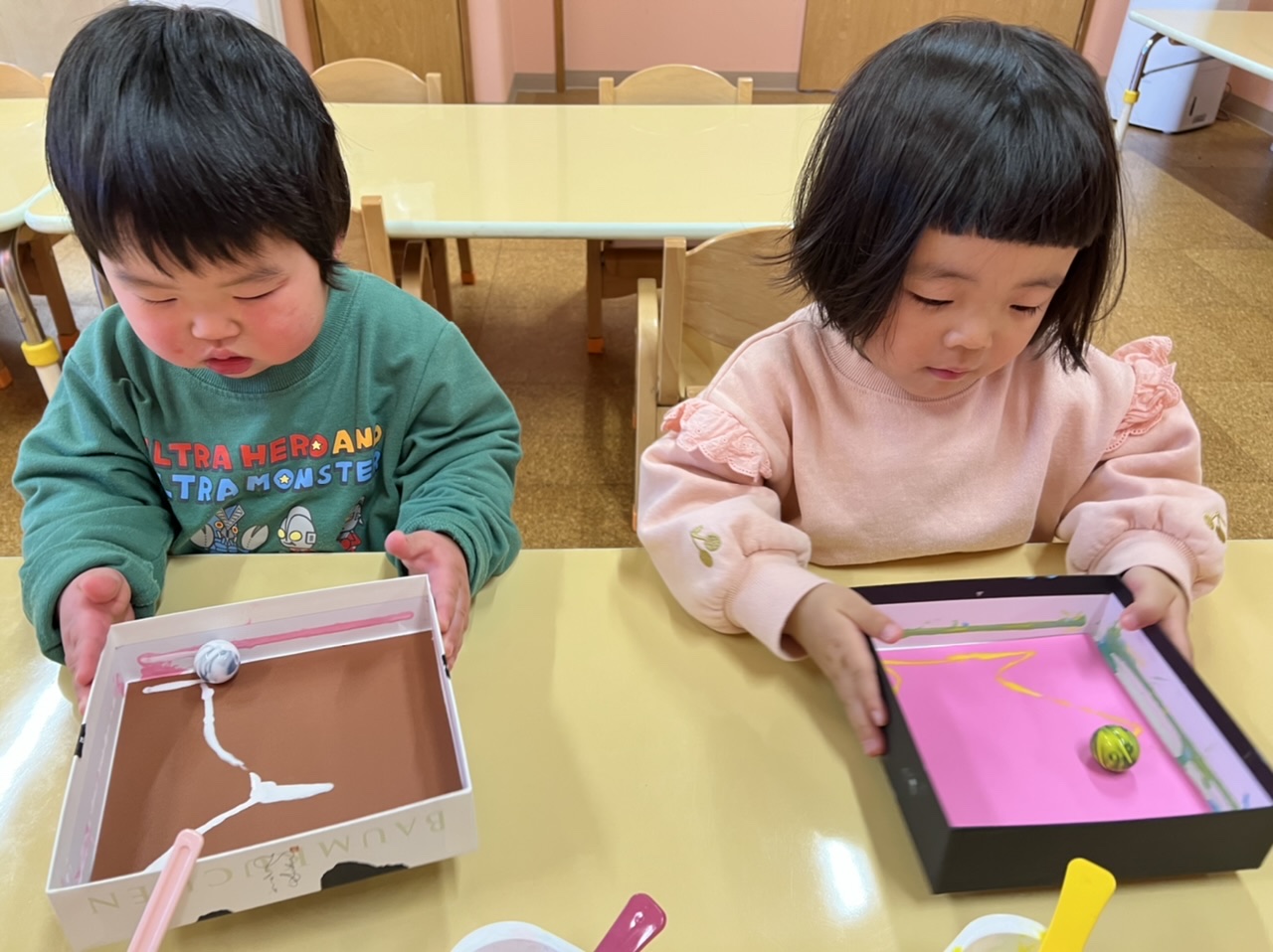 どうやって、子どもたちに手伝ってもらおうかな?と製作のアイデアを検索してみるとおもしろい技法を発見しました。【ビー玉コロコロアート】名前だけでとっても楽しそうですよね!!