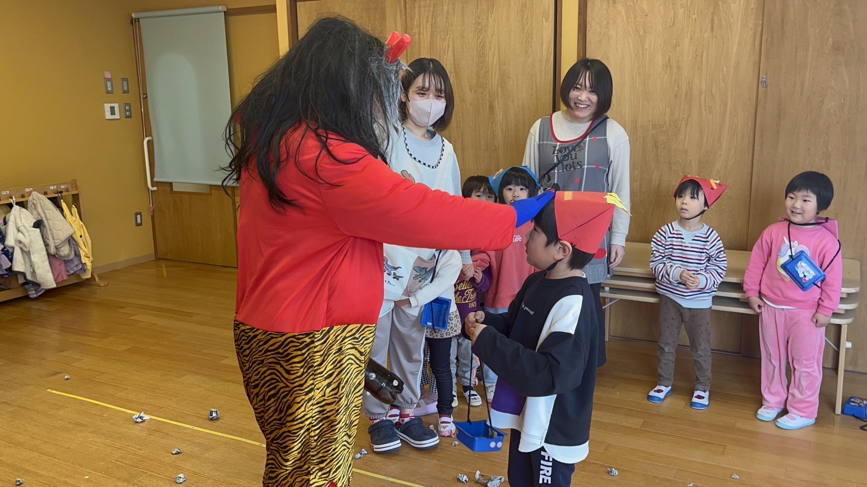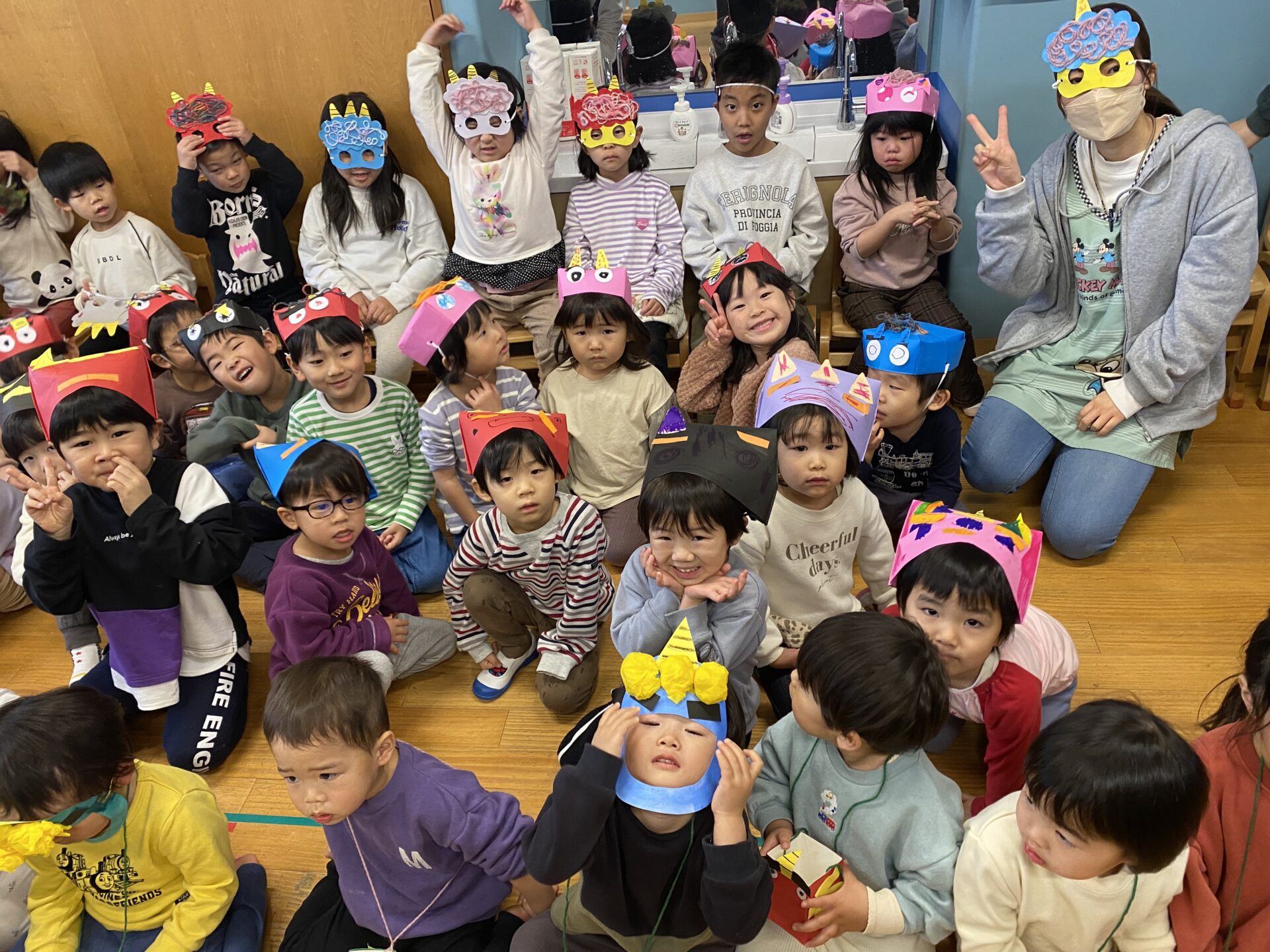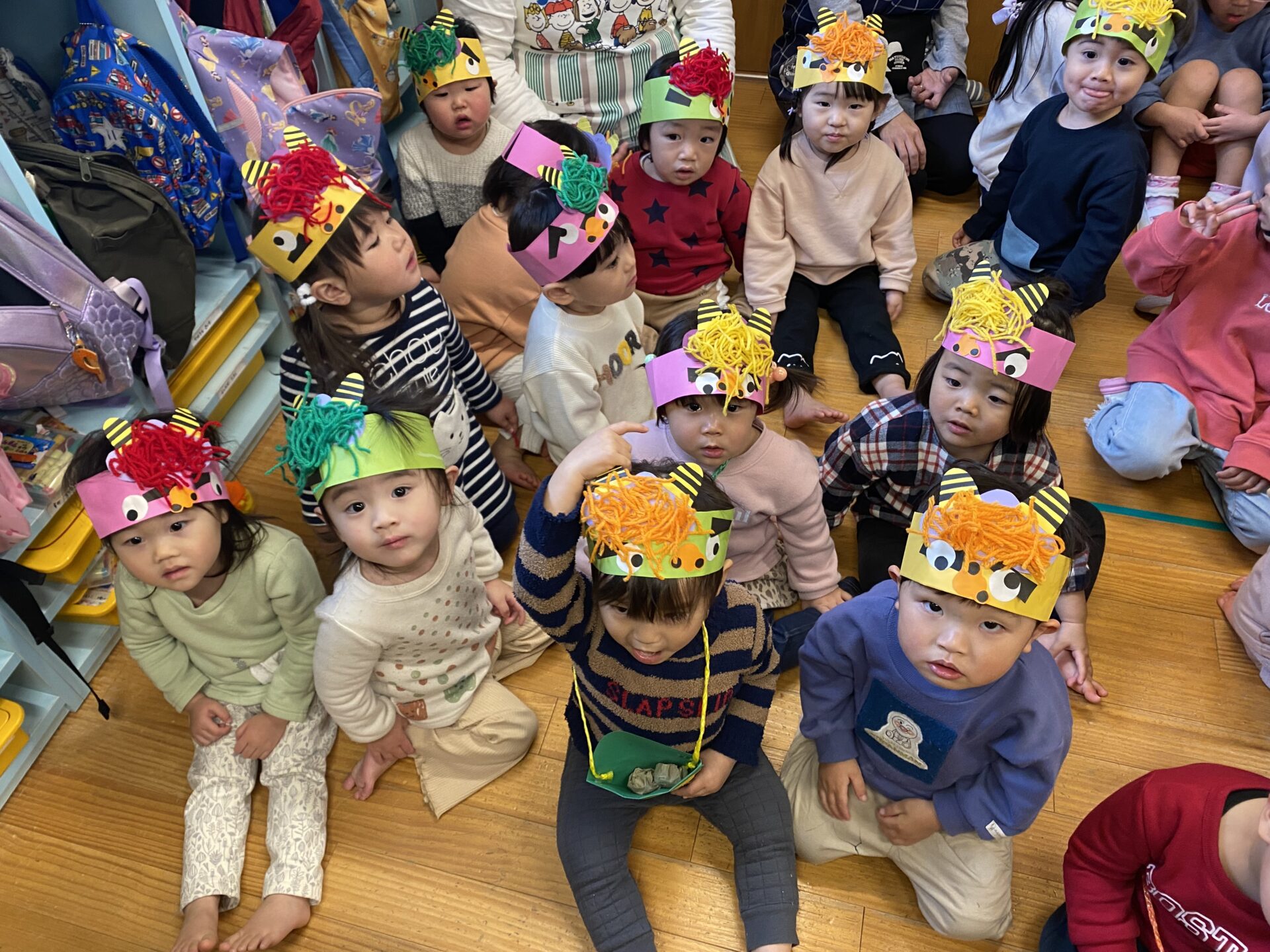 自分で作った鬼の被り物をつけています。とても上手に作っているので、かわいい❤️とウキウキしているのは、大人だけ。子どもたちは、ちょっとドキドキ、そわそわしていました。