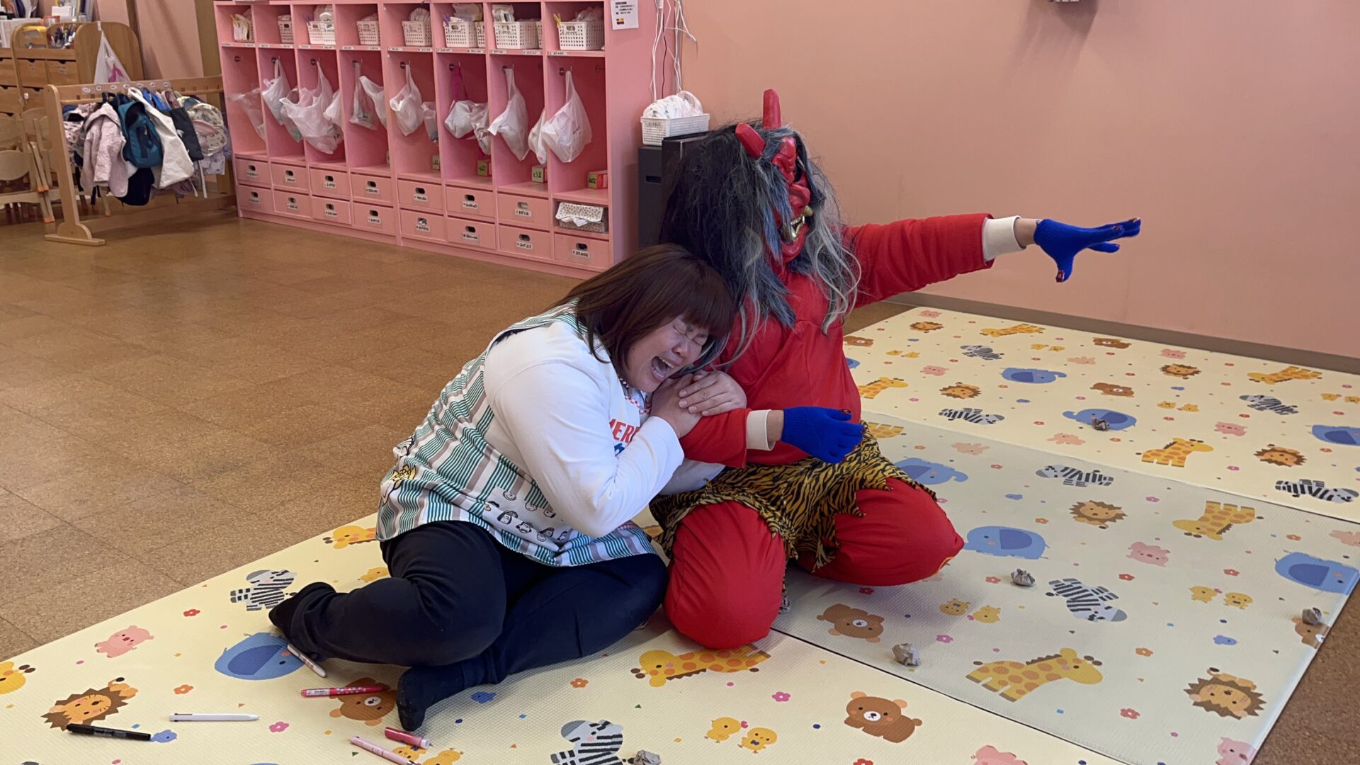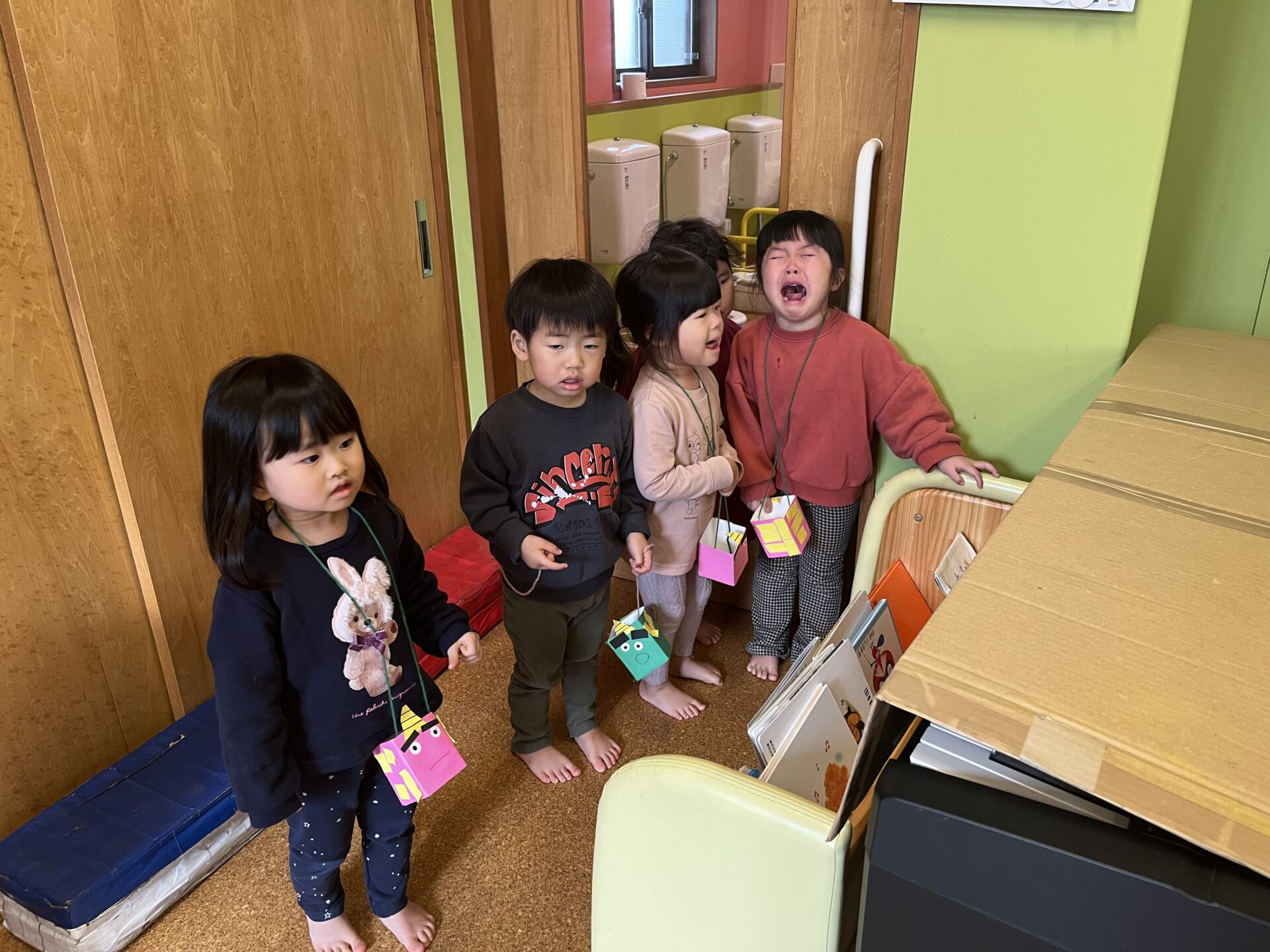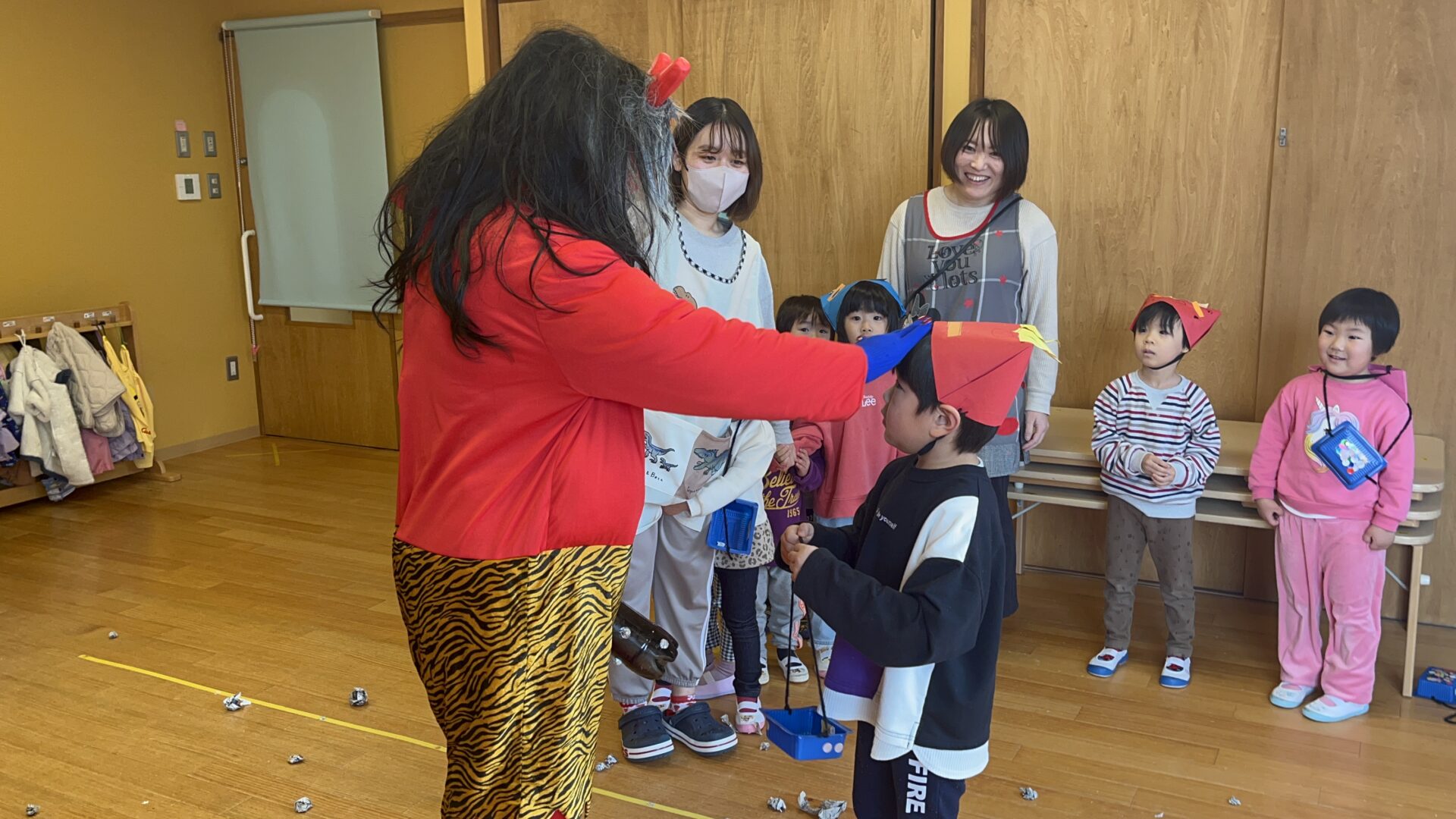 2024.02.21 主任 ブログ 3歳児 2歳児 1歳児 0歳児 節分👹 保育園に鬼がやってきました。 初めての鬼に動けません💦びっくり ドキドキ 怖さもある0歳児。 部屋の隅に逃げて様子を見る👀2歳児。 鬼と握手をし頭をなでられ、勇気ある3歳児。 鬼に連れていかれたN先生。誰も助けにきてくれませんでした💦 みんな、自分の中にいる、いろいろな鬼を退治し、元気いっぱい仲良く保育園で過ごせます! もうすぐ春ですね🌸 一覧へ戻る