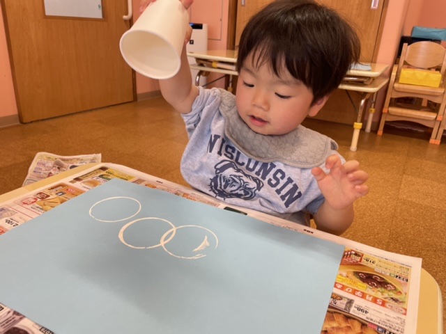 水色の画用紙に白の絵の具を使って紙コップでスタンプをしました!!