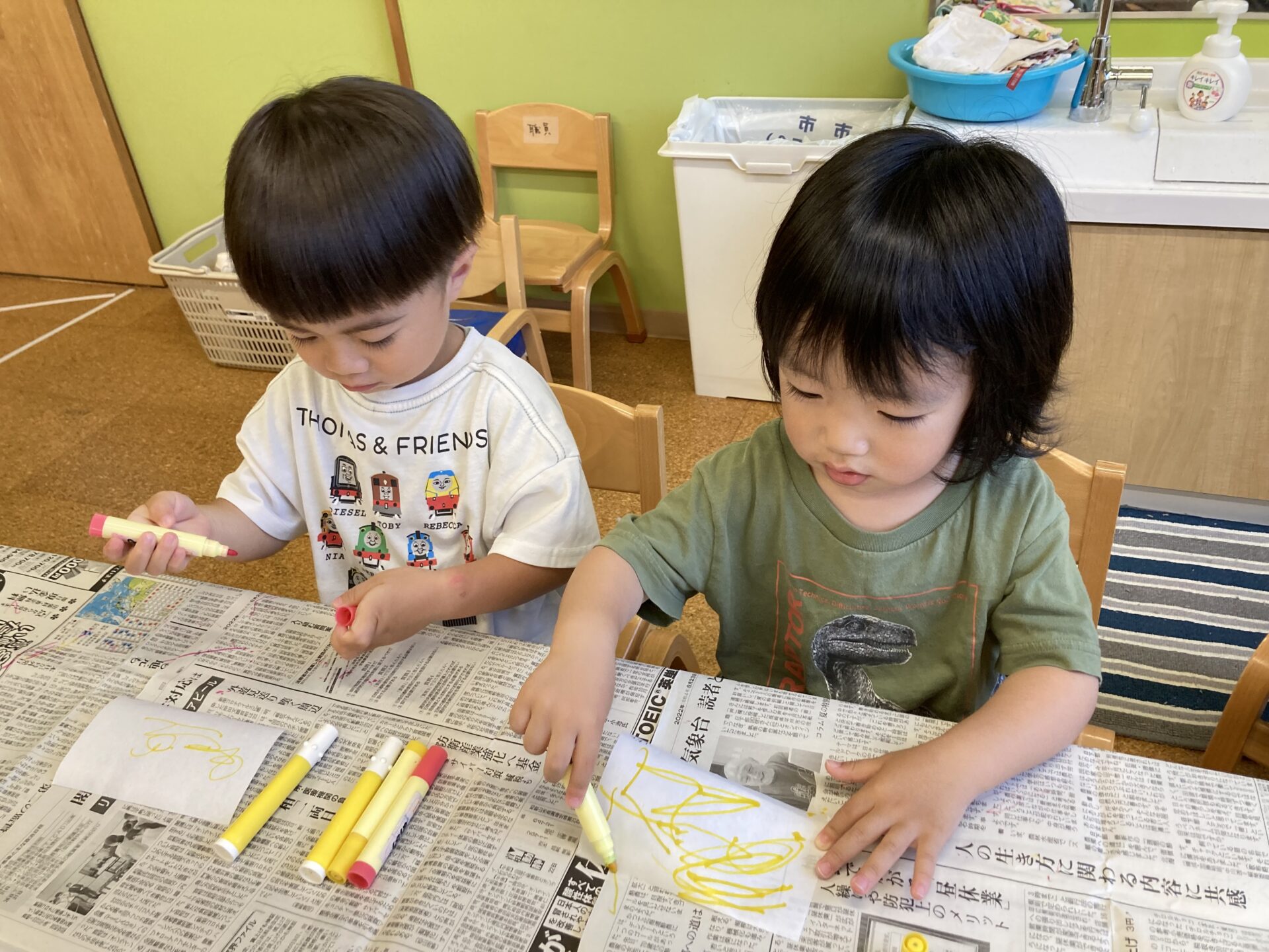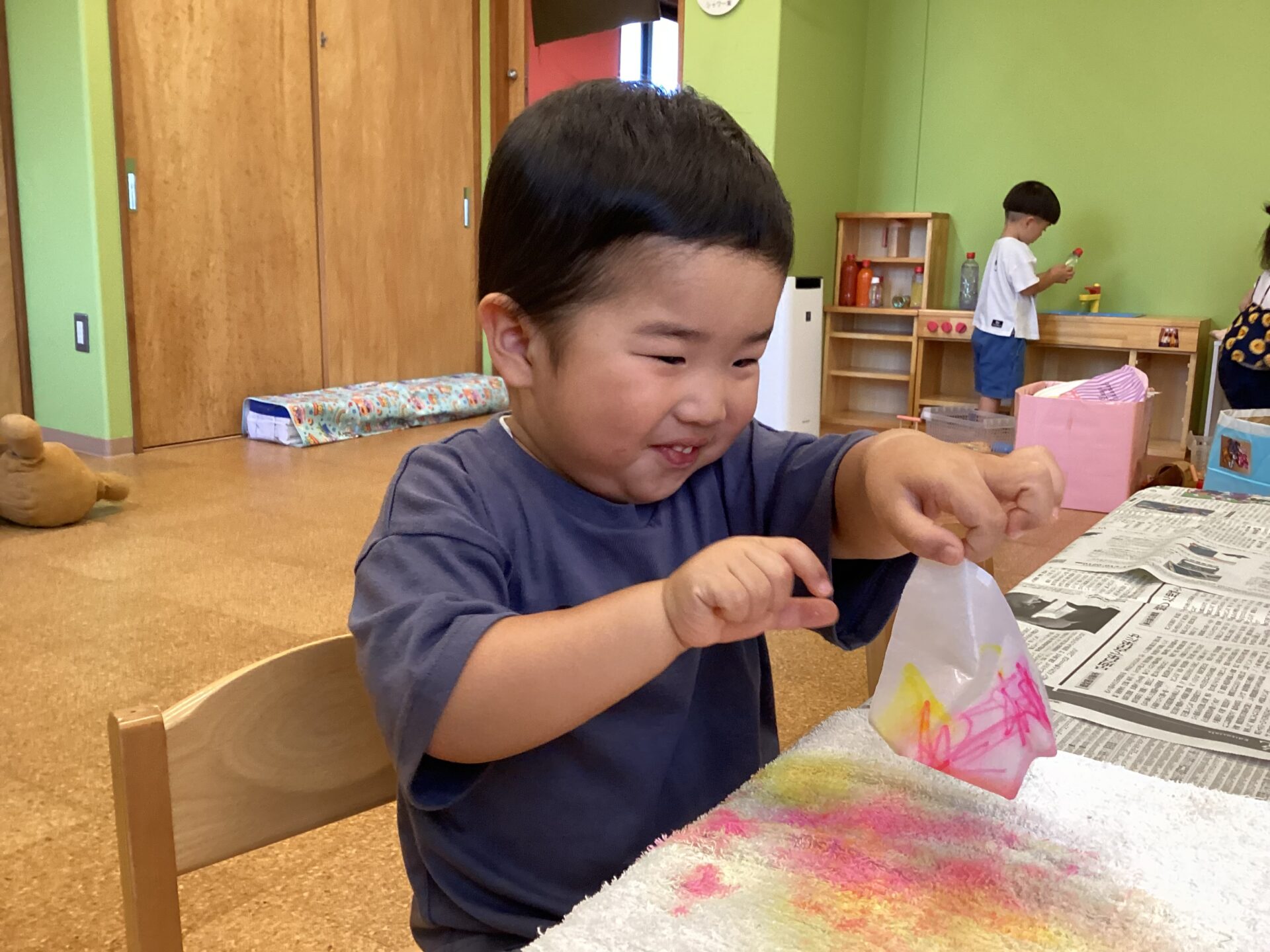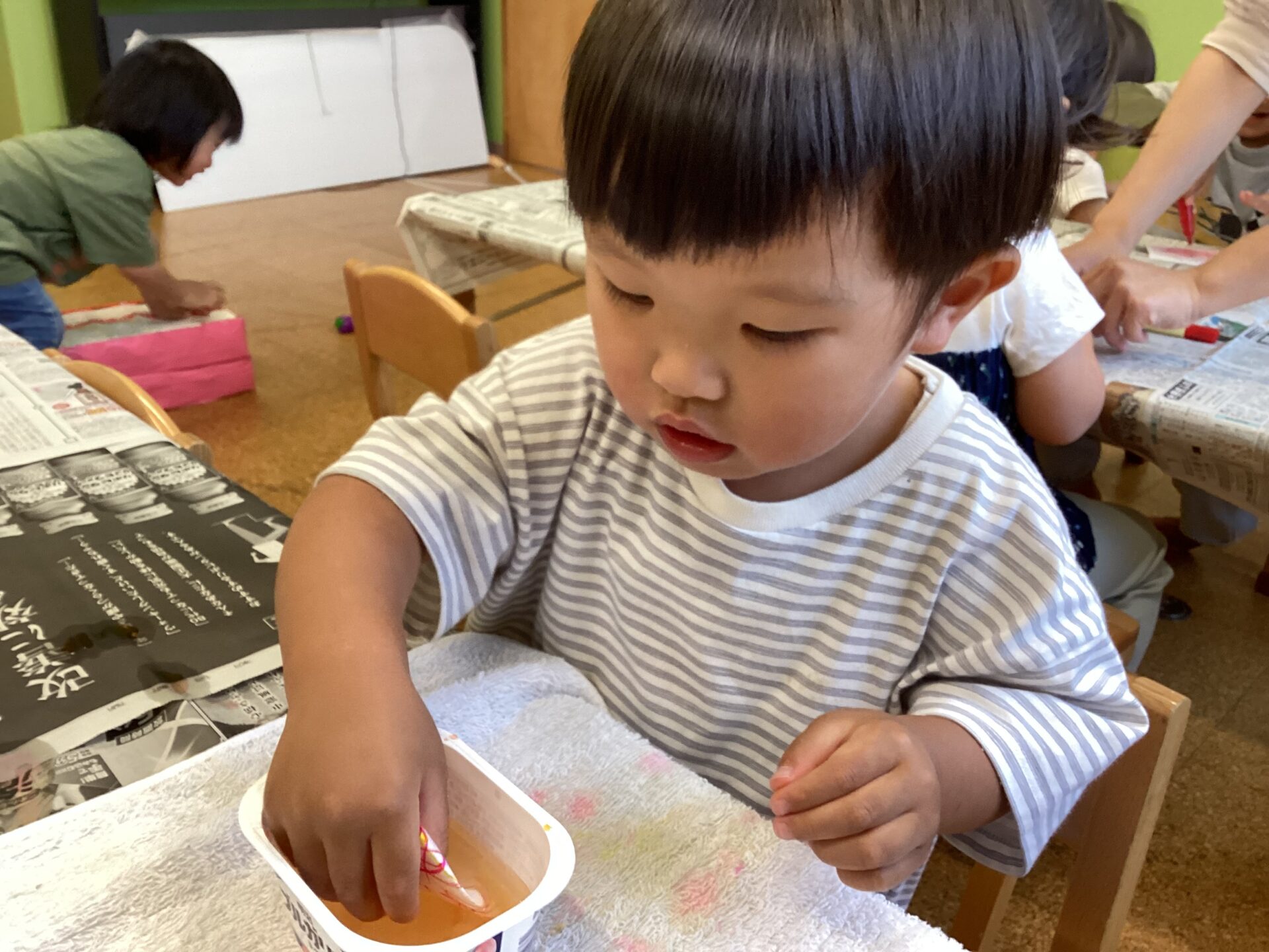次に、紙を折って水の中につけます。紙を自分で折ることに挑戦している子もいました☺️