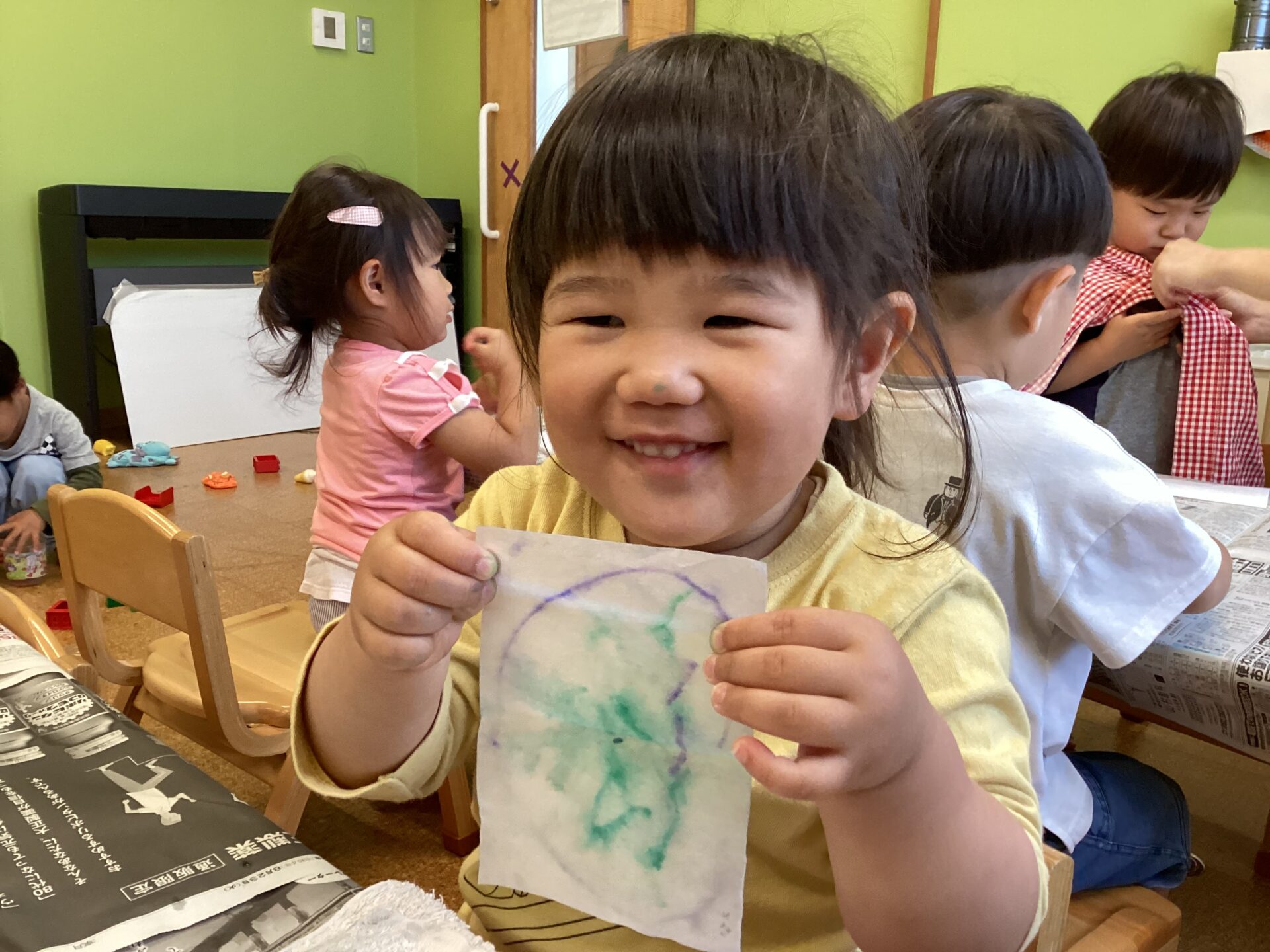 顔の中に目、鼻、口があることを認識できるのは、だいたい1歳後半ですが、それらが顔の中のどの位置にあるか理解し、さらに紙に描くというのは意外と難しいことなのです。「顔が描ける」ということは、素晴らしいことです。