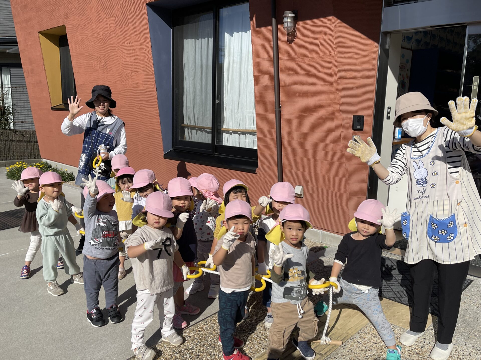 はめる時に指が迷子になって(笑)「赤ちゃん指どこいった~?」と大笑い。軍手をしていざ出発!!