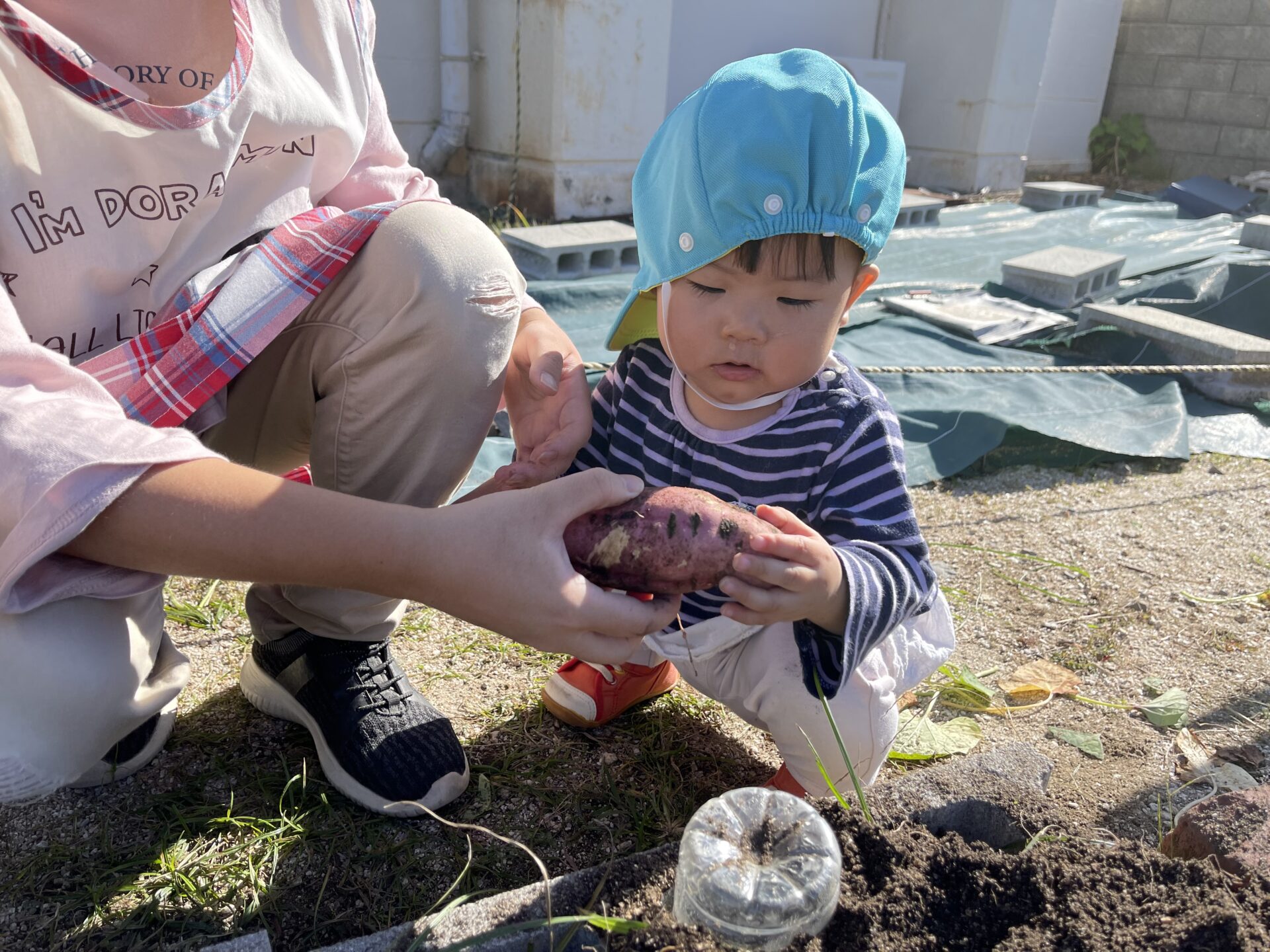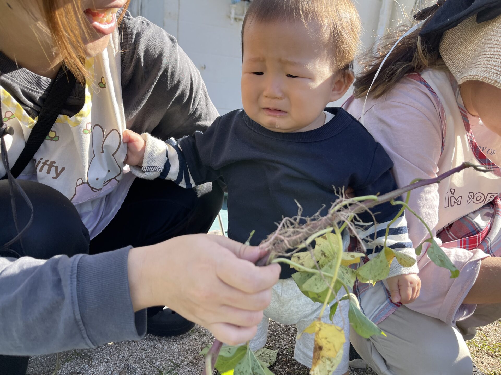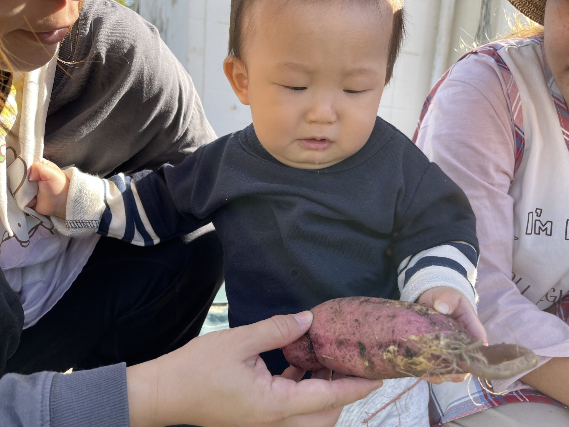 恐る恐る、お芋を触っていました。(先生のエプロンをぎゅっとにぎりしめている所が可愛いですね😊)