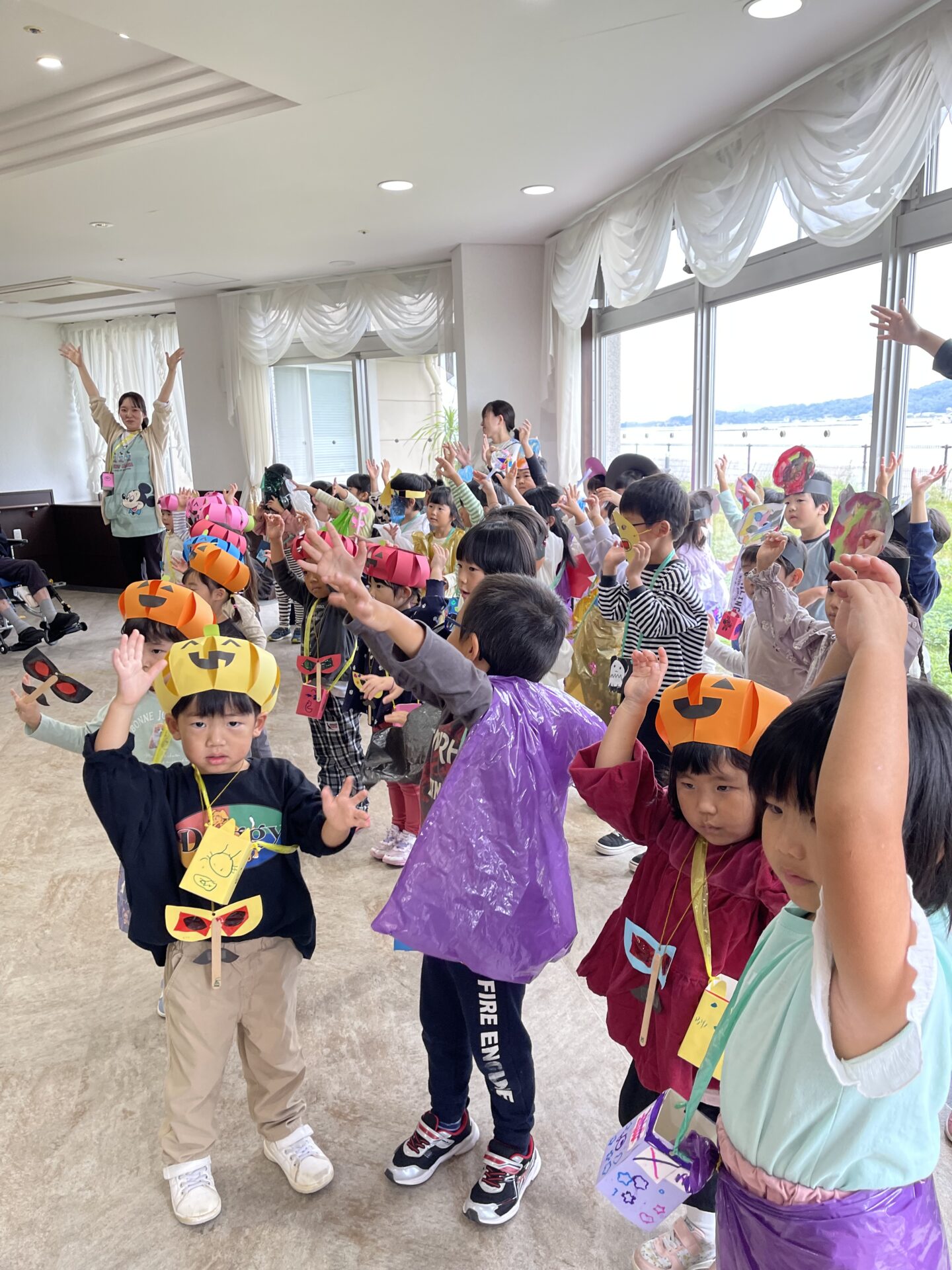 そのあと、乳児さんは、園内で宝さがしゲームをしながらお菓子を貰い、幼児チームさんは、近くの高齢者施設「ヴェリタス宮島口訪問」し、おじいちゃん、おばあちゃんとの交流を楽しみました😊