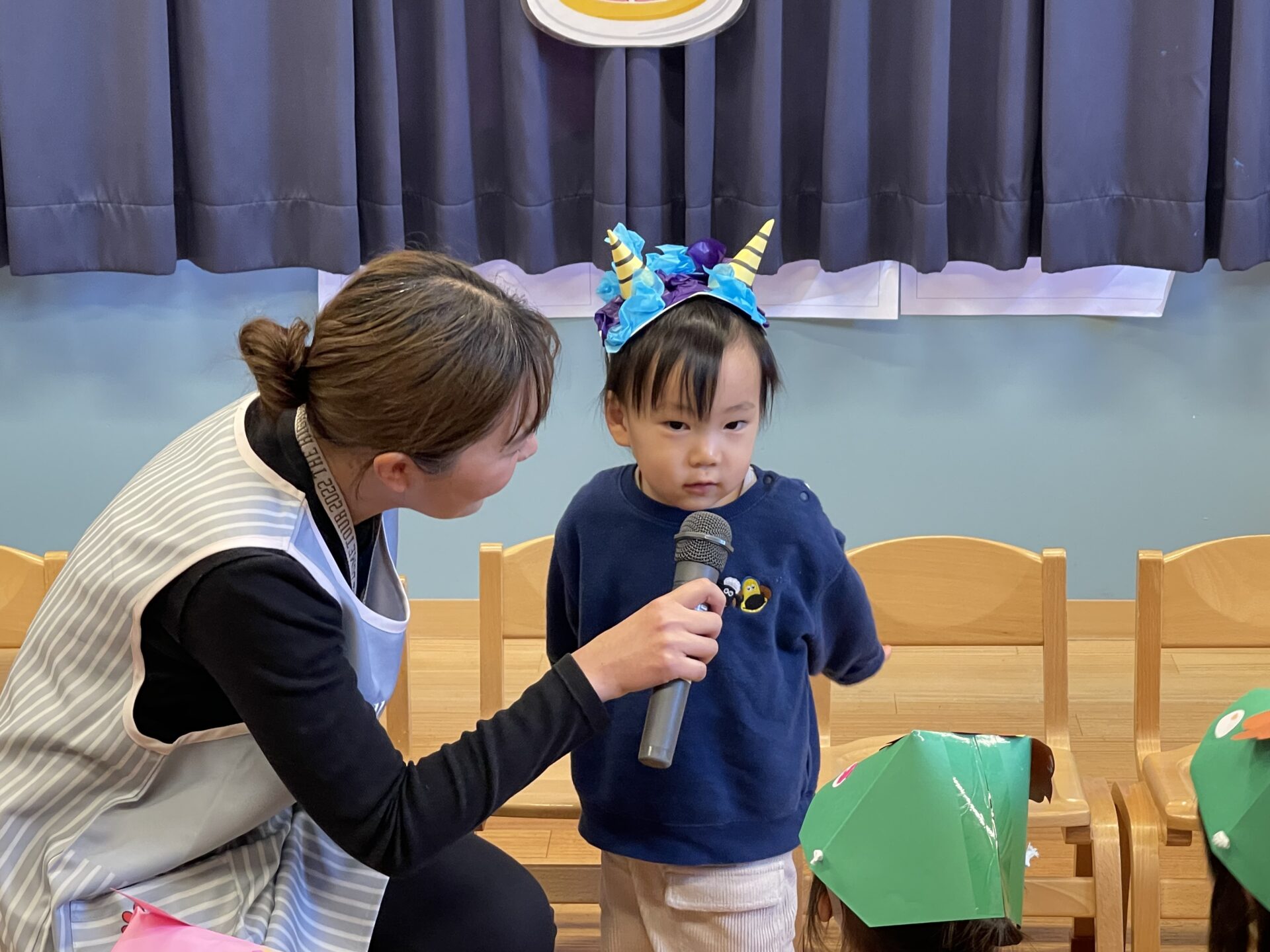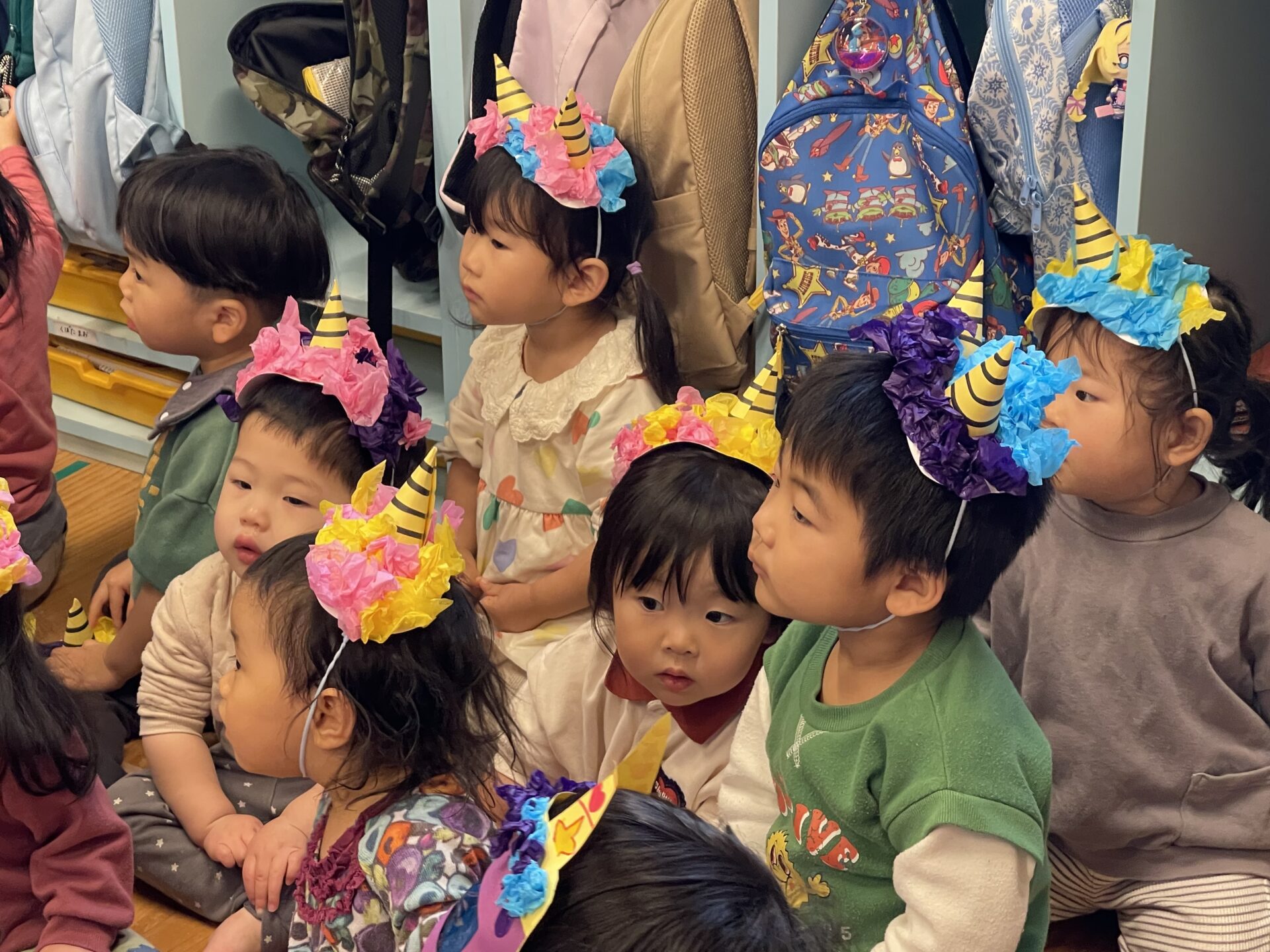 1歳児クラス・だいちチームは、カチューシャタイプ。自分たちで好きな色を選んで飾り付けました😊