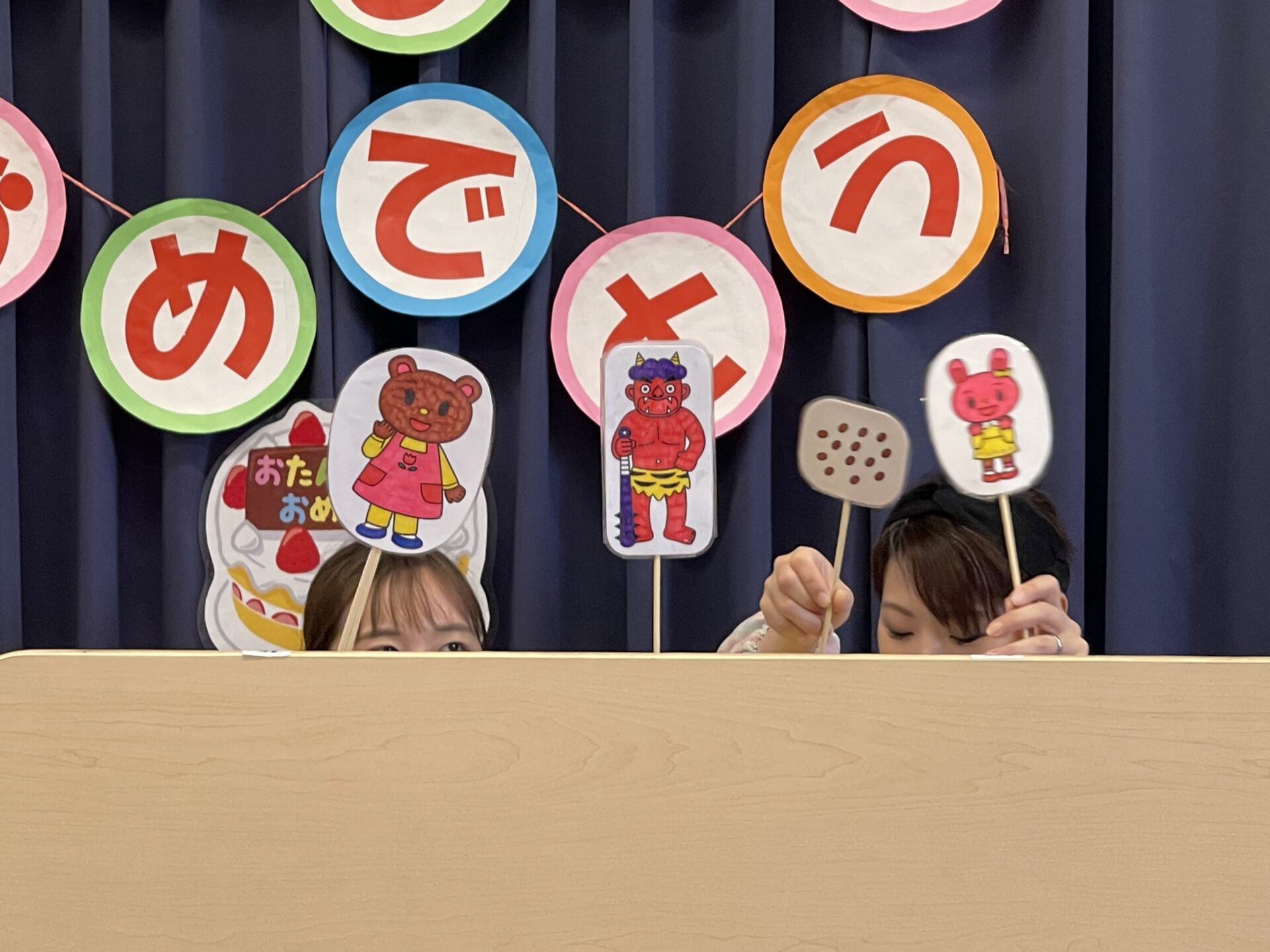 先生の出し物は、節分の由来にちなんだペープサート。『節分ってなに?』『どうして豆を投げるの?』など、みんな真剣にお話を聞いていました。豆は、年の数よりひとつ多く食べるんですって!