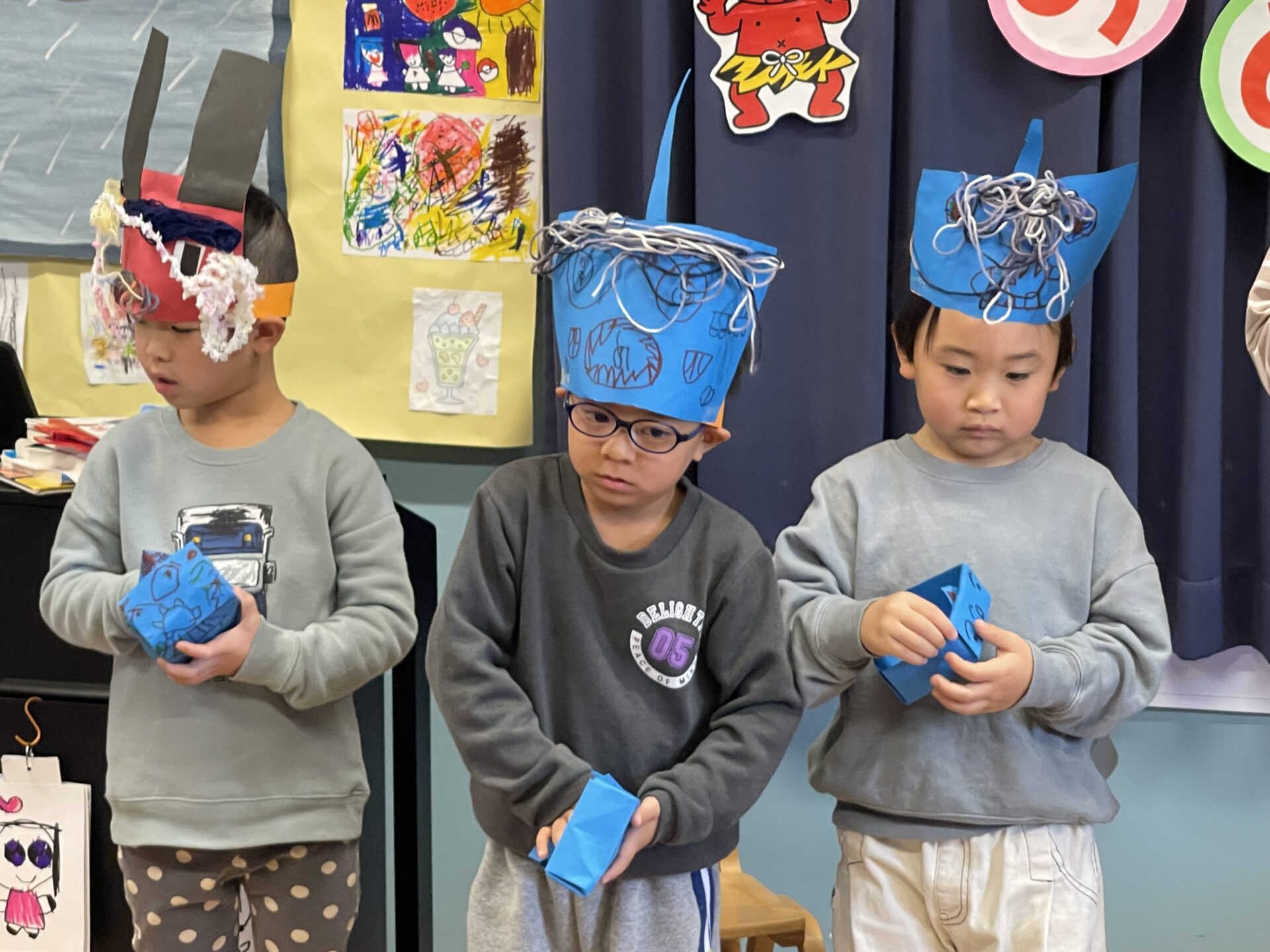3歳児・にじチームさんは、画用紙で箱を作って帽子型になっていました。ハサミも使って作りました。
