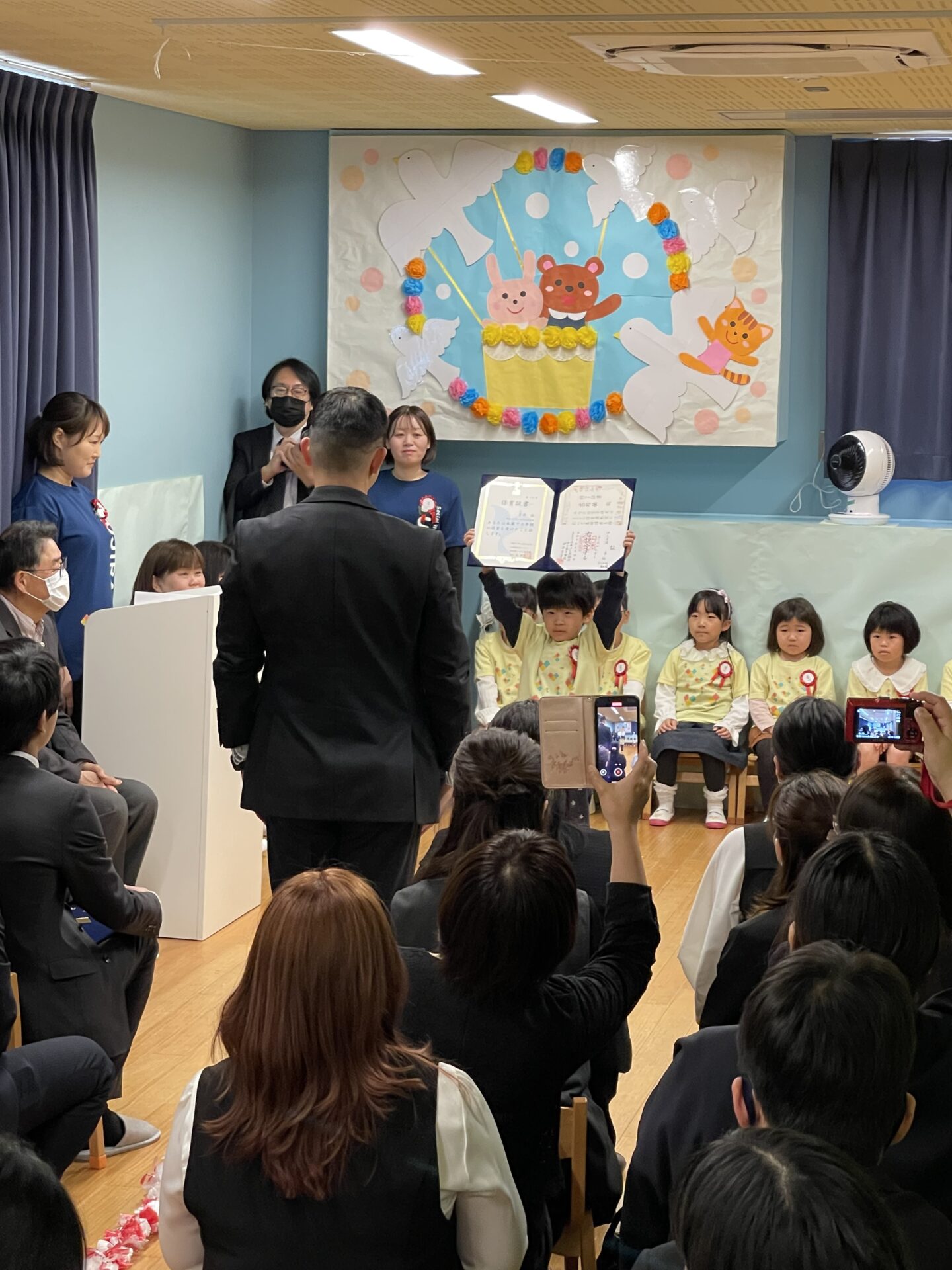 廿日市くじら保育園では、証書をもらった後に「保育園で楽しかったこと」をお母さんお父さんの前で伝えます。