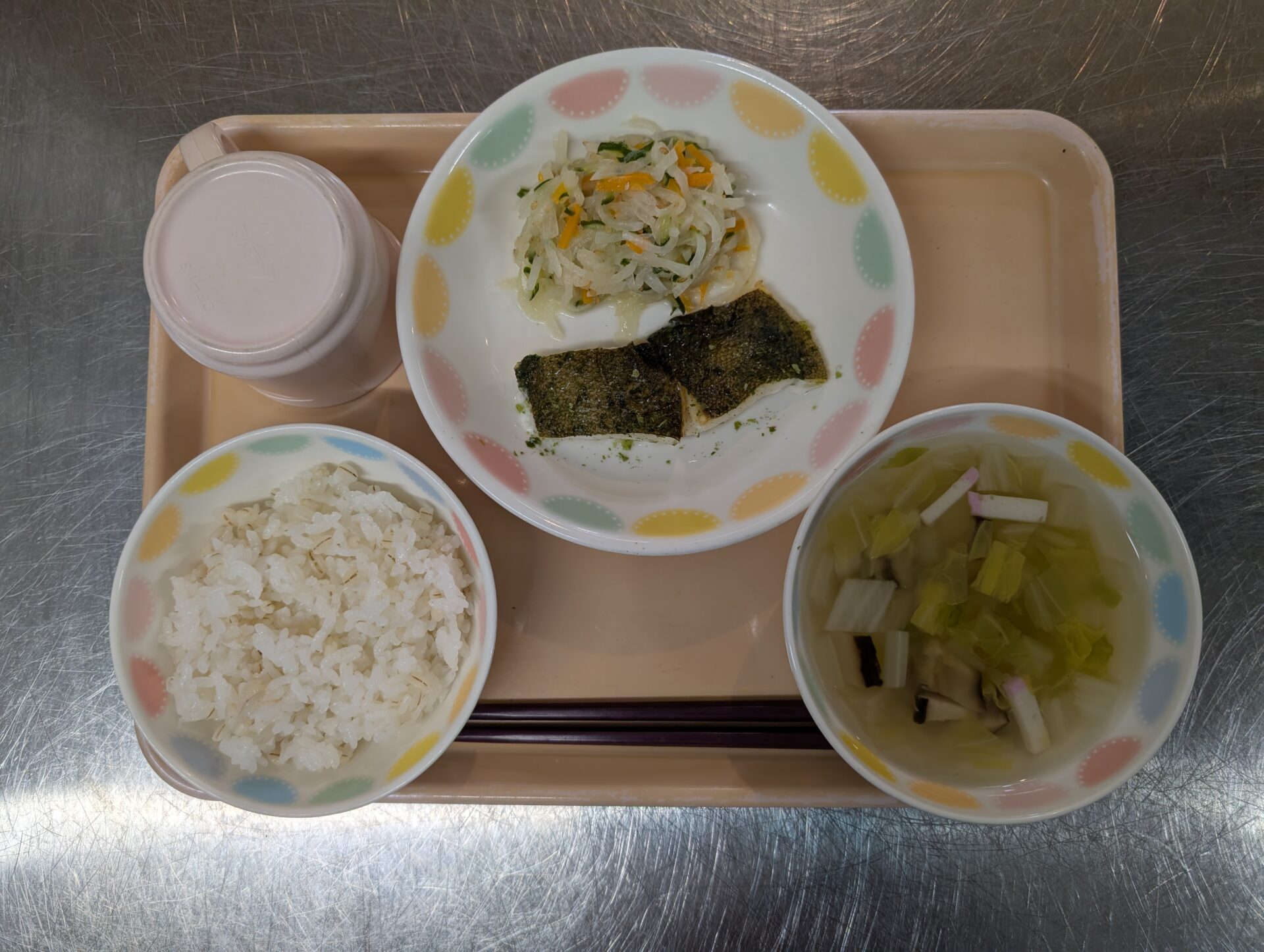 今日の給食は、麦ごはん、カレイの磯辺焼き、大根ナムル、春雨スープ でした。