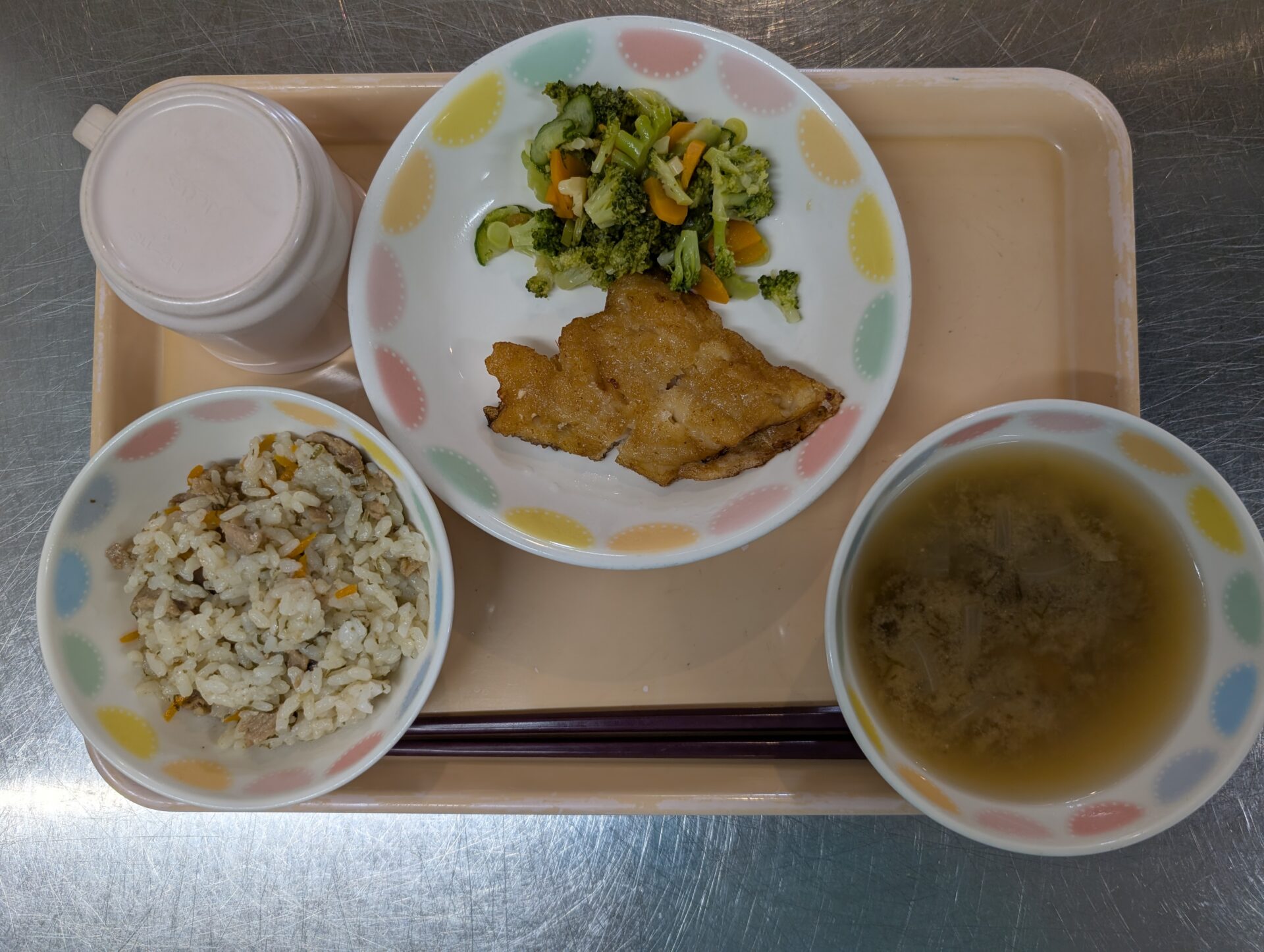ジューシーとは、沖縄県の言葉で「炊き込みご飯」という意味だそうです。今日のご飯を見ると、なるほど、豚肉、椎茸やニンジン、昆布など具沢山の炊き込みご飯でした。意味を知って納得です。