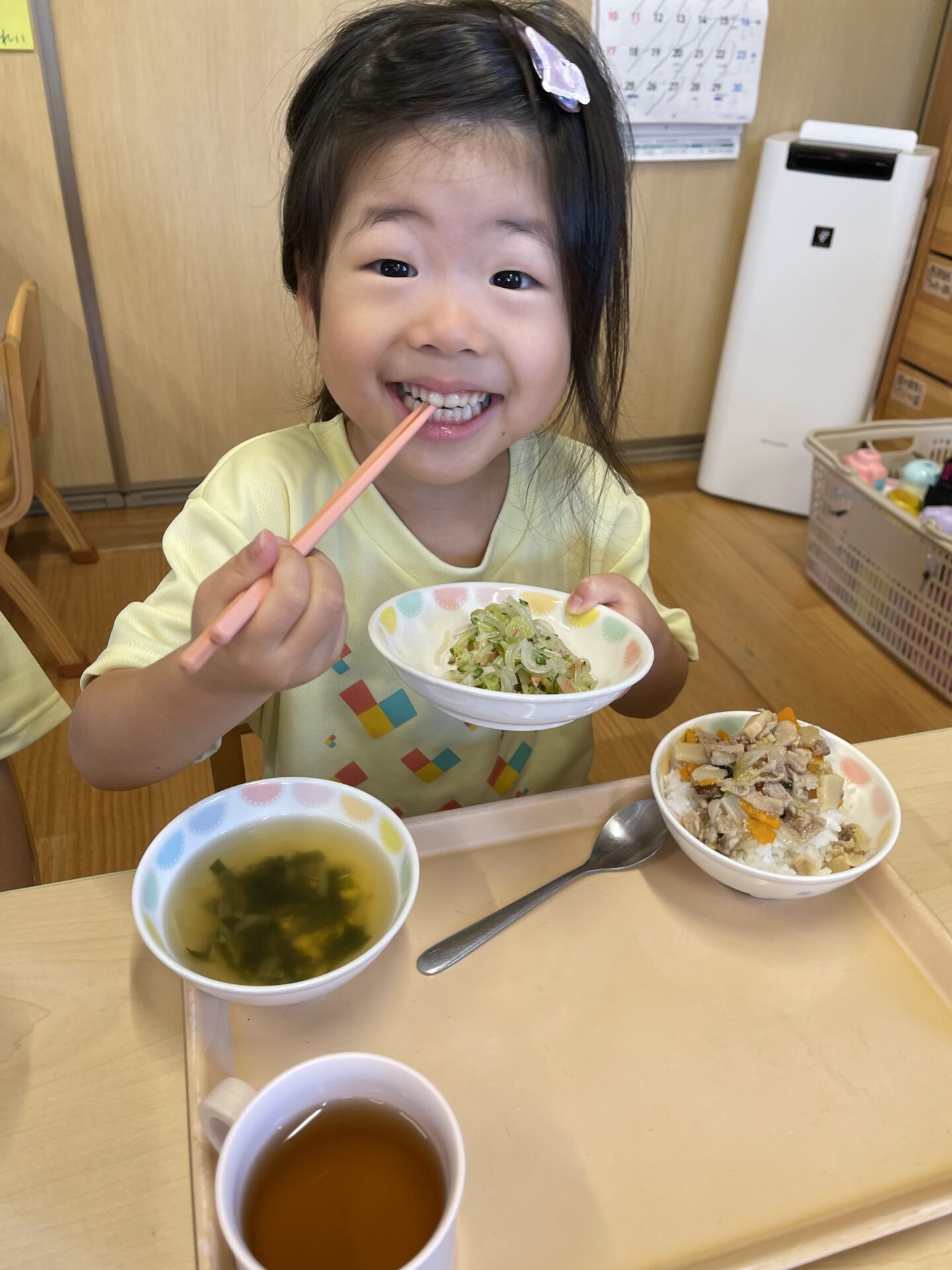 たくさん体を動かした後の給食は、格別おいしい!!いい顔をして食べていましたよ。