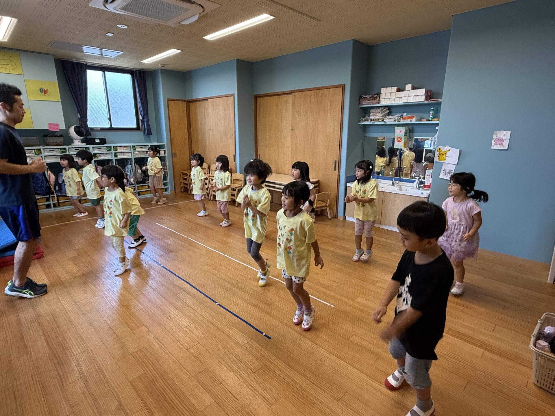 体操教室は、黄色い「くじらTシャツ」を着ようねと話をしています。