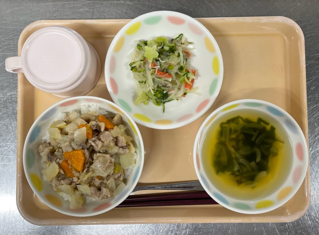 今日の給食は、中華丼ぶり 春雨サラダ わかめスープ でした。