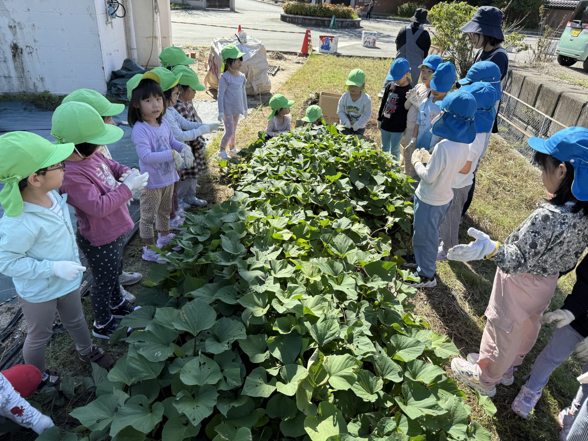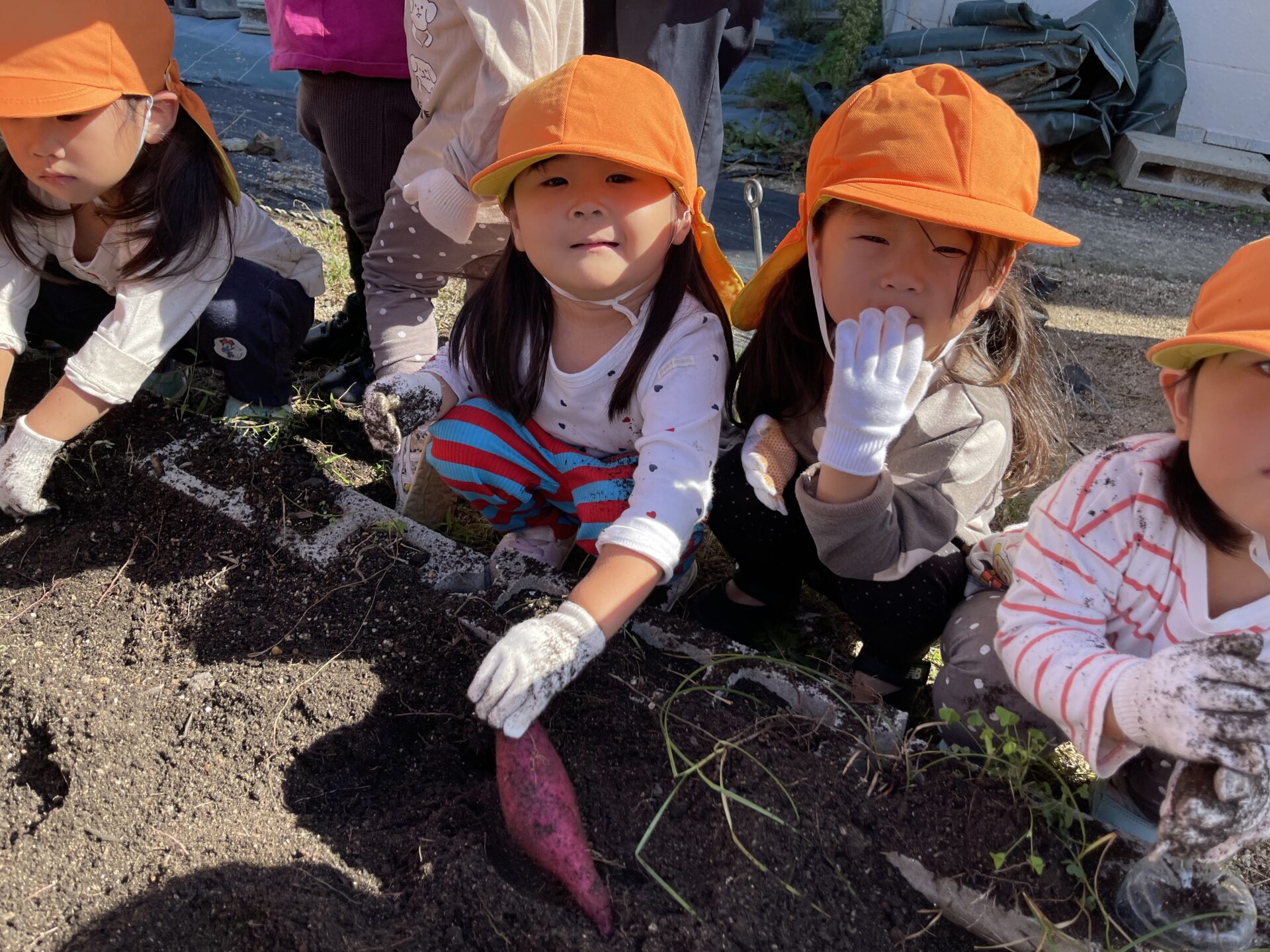 土の中から大きな芋が出てくると、「あったー!」「みて!大きいんよ!」と大興奮で見せ合っていました。