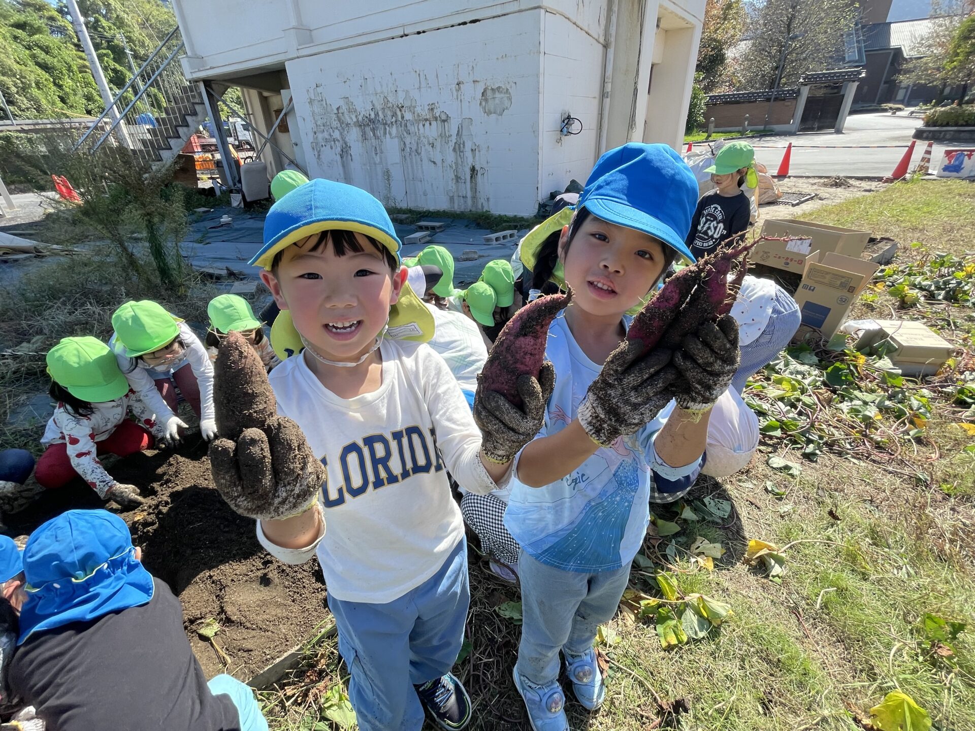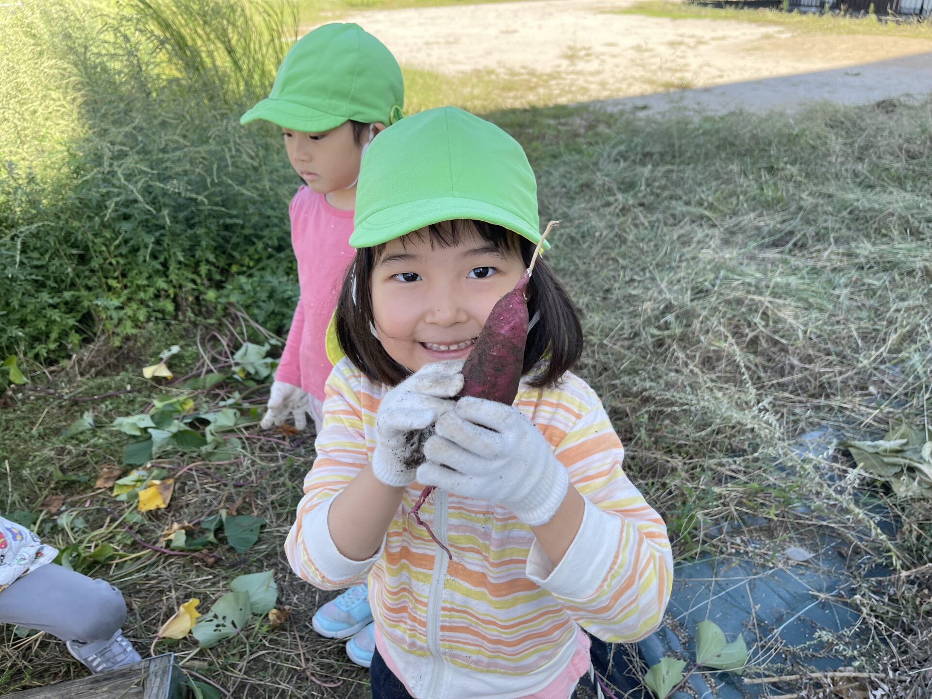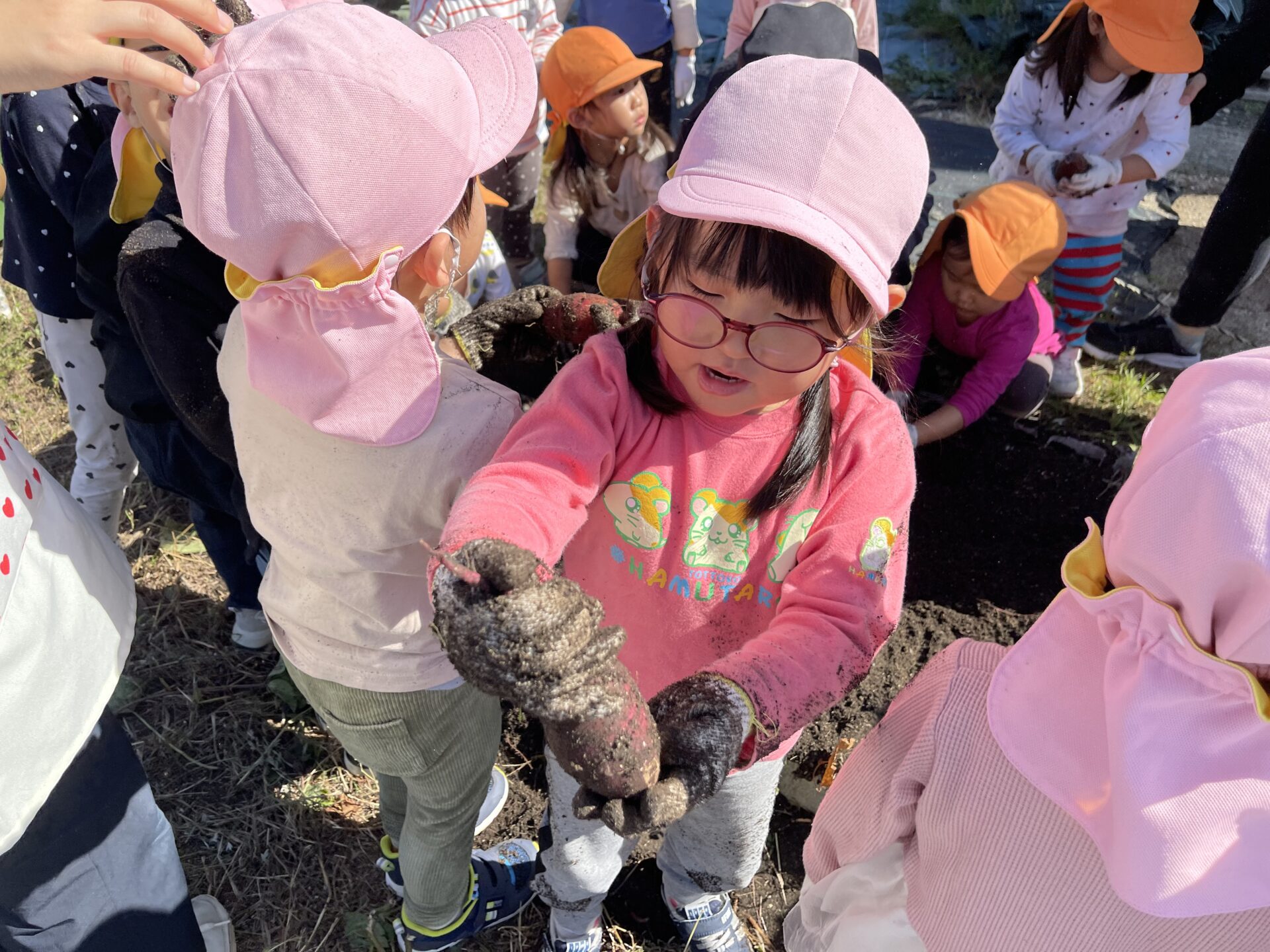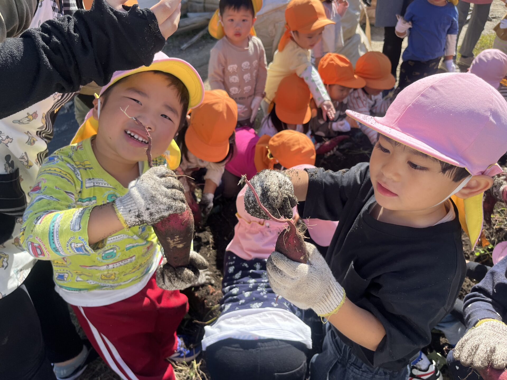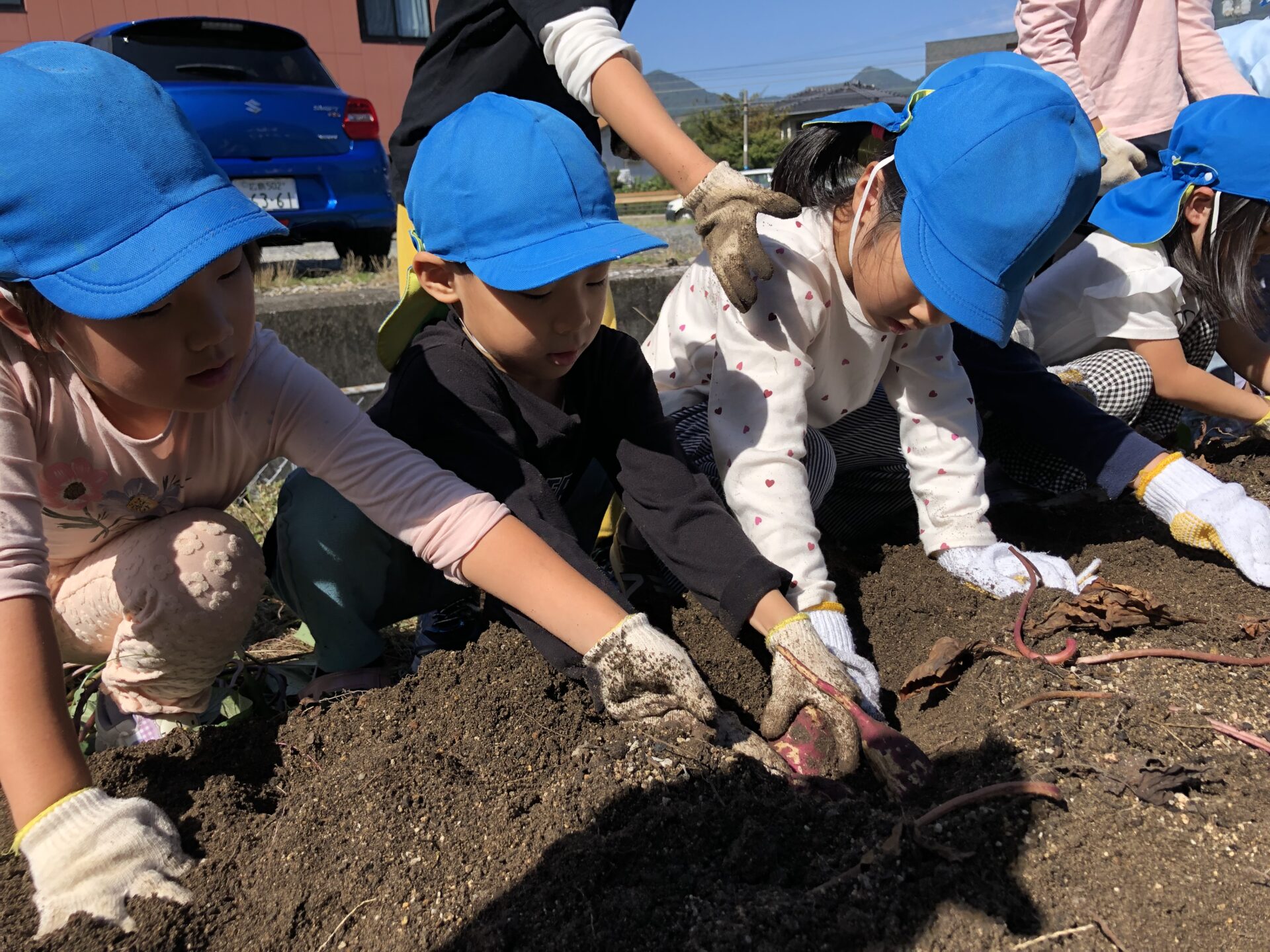土の中から大きな芋が出てくると、「あったー!」「みて!大きいんよ!」と大興奮で見せ合っていました。