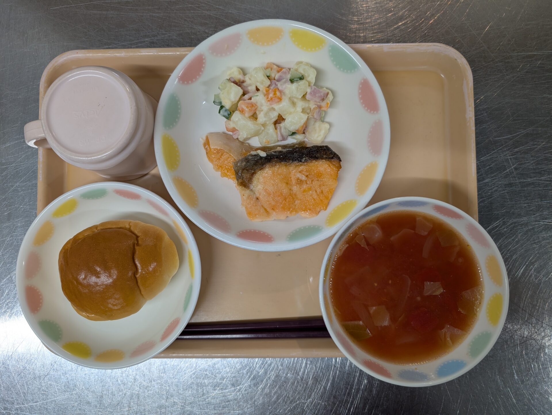 そして、今日の給食は、ロールパン、鮭のムニエル、マセドアンサラダ、トマトスープ