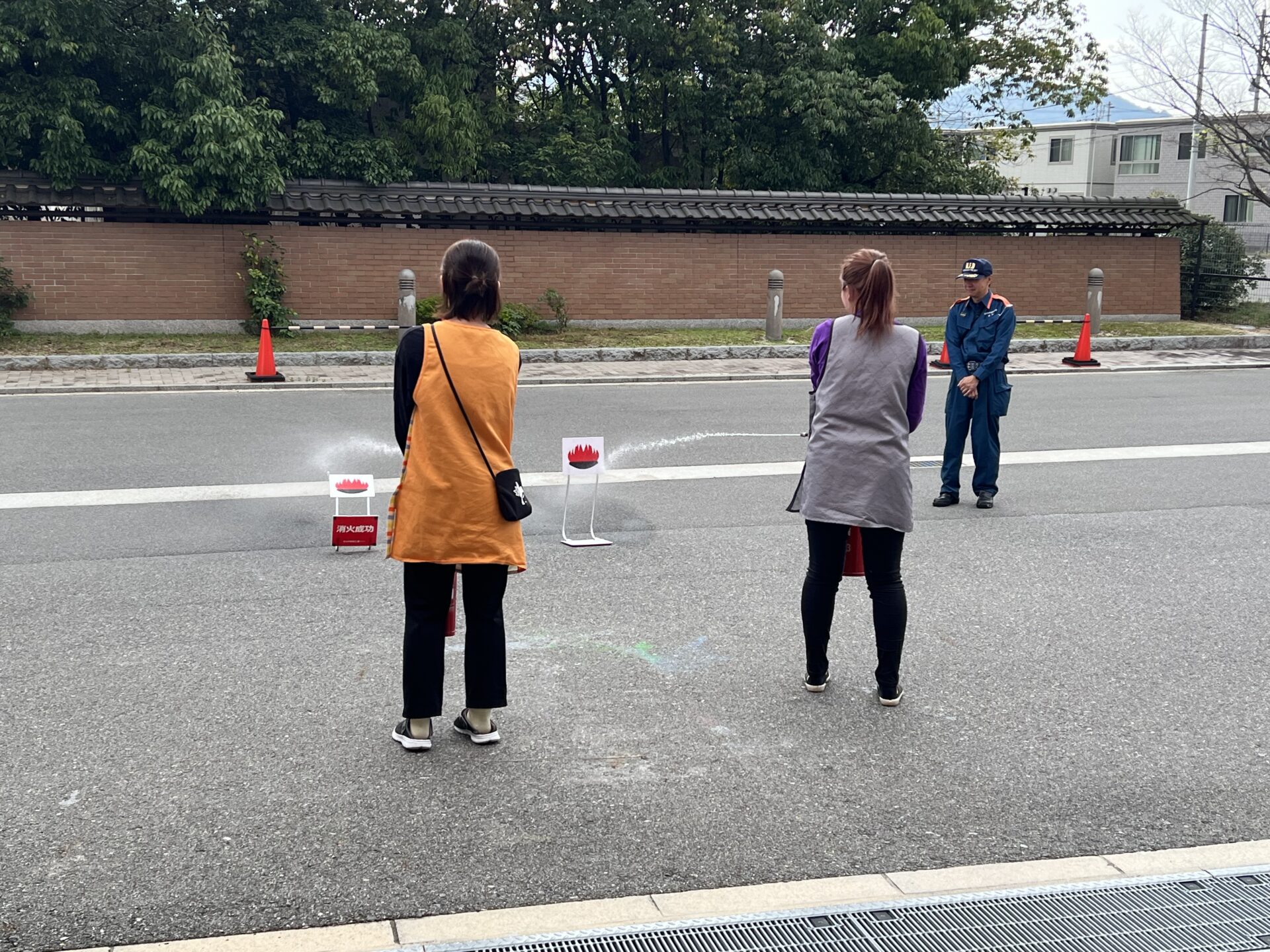消火器訓練では、「火事だー!」と叫んで、水消化器を使って、的を倒します。