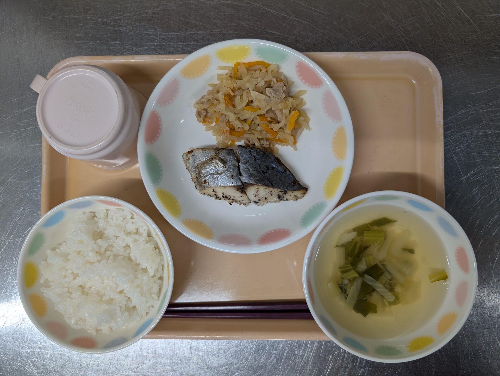 今日の給食は、ご飯 サワラのゆかり焼き 切り干し大根の煮物 チンゲンサイのすまし汁でした。