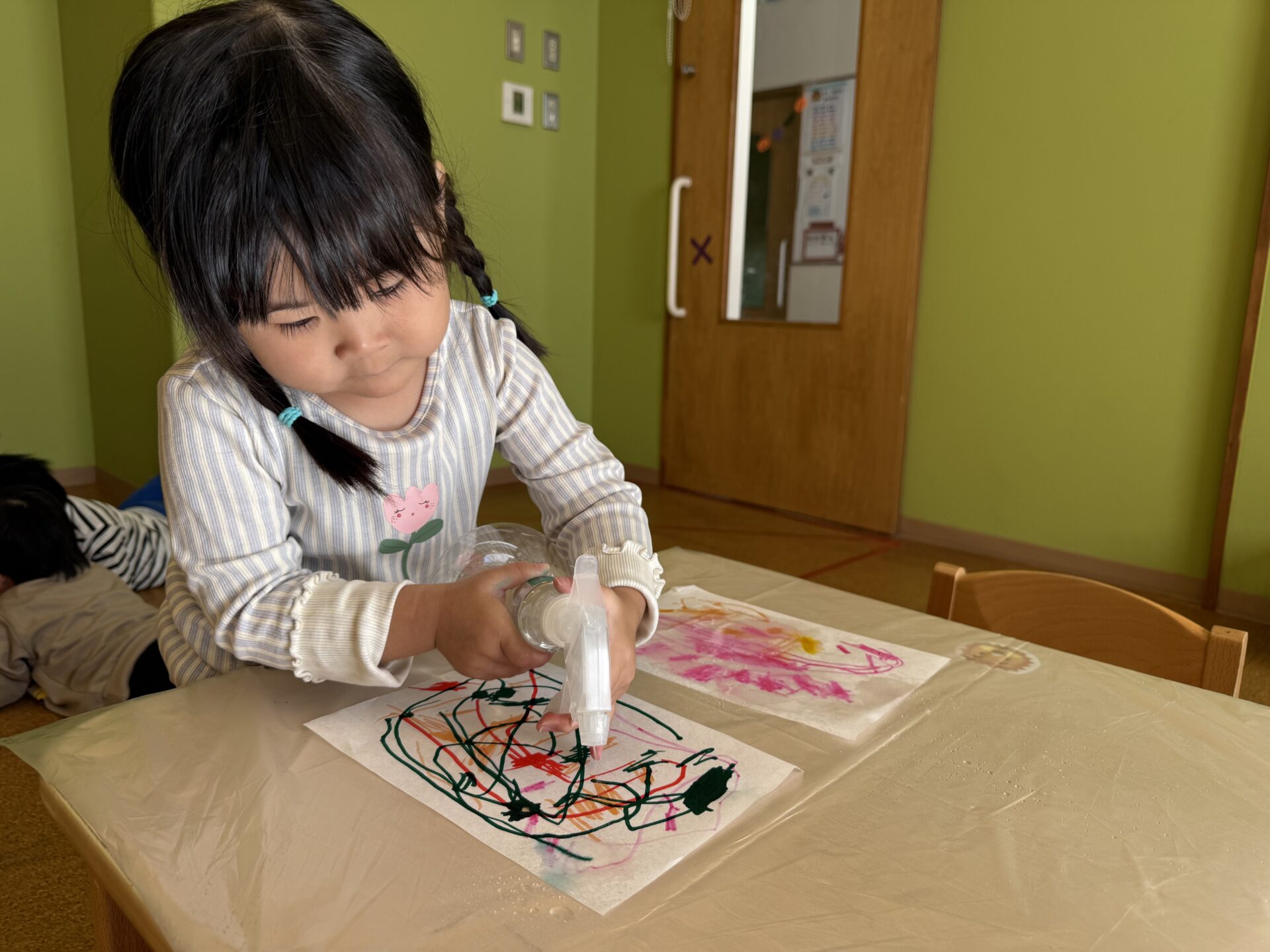 描いた半紙に霧吹きで水をかけると色が滲んでいきます!