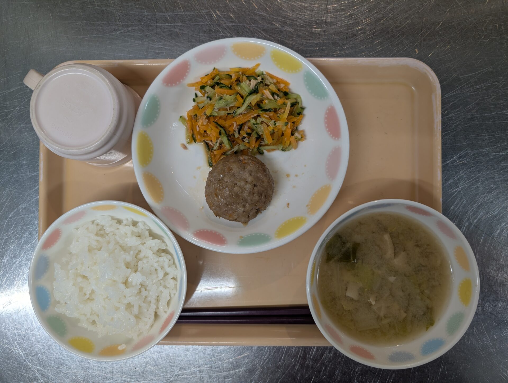 本日の給食は、ご飯 レンコンのつくね焼き にんじんサラダ 白菜の味噌汁でした。
