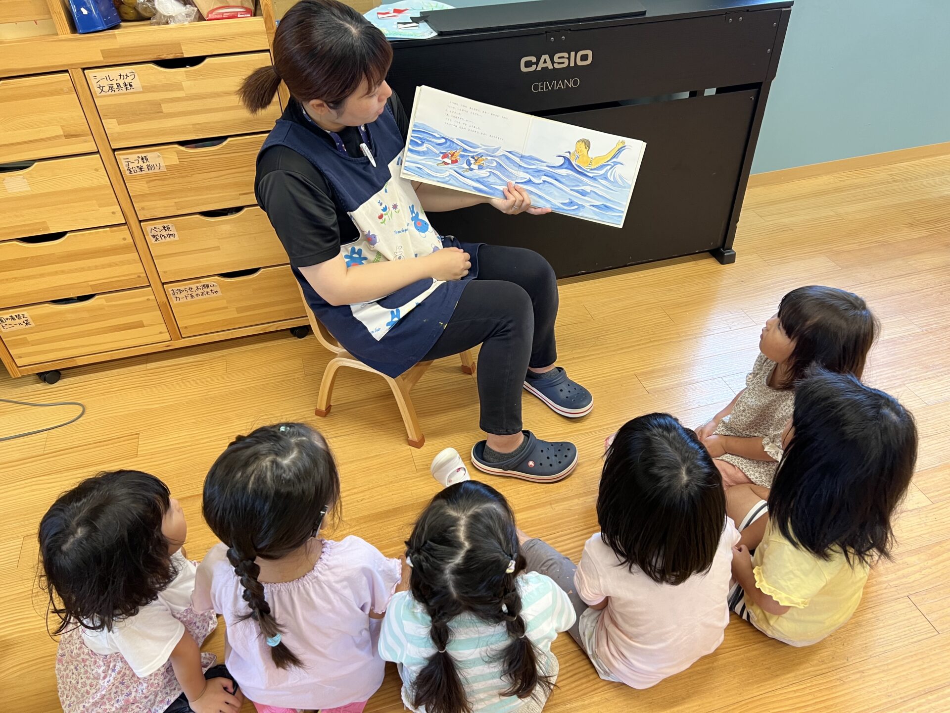 この絵本の色々な泳ぎ方を見て、「こんなふうに泳いでみたい!」と意気込んでいます。