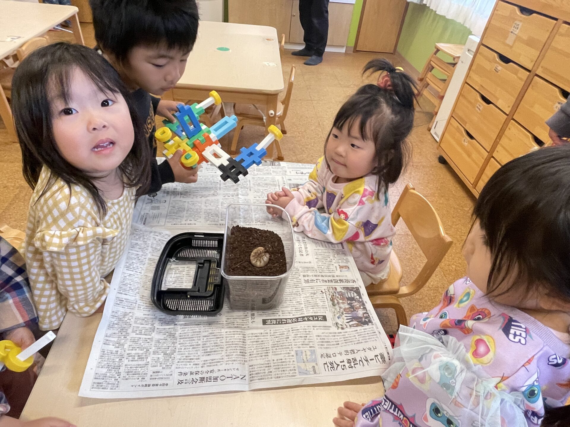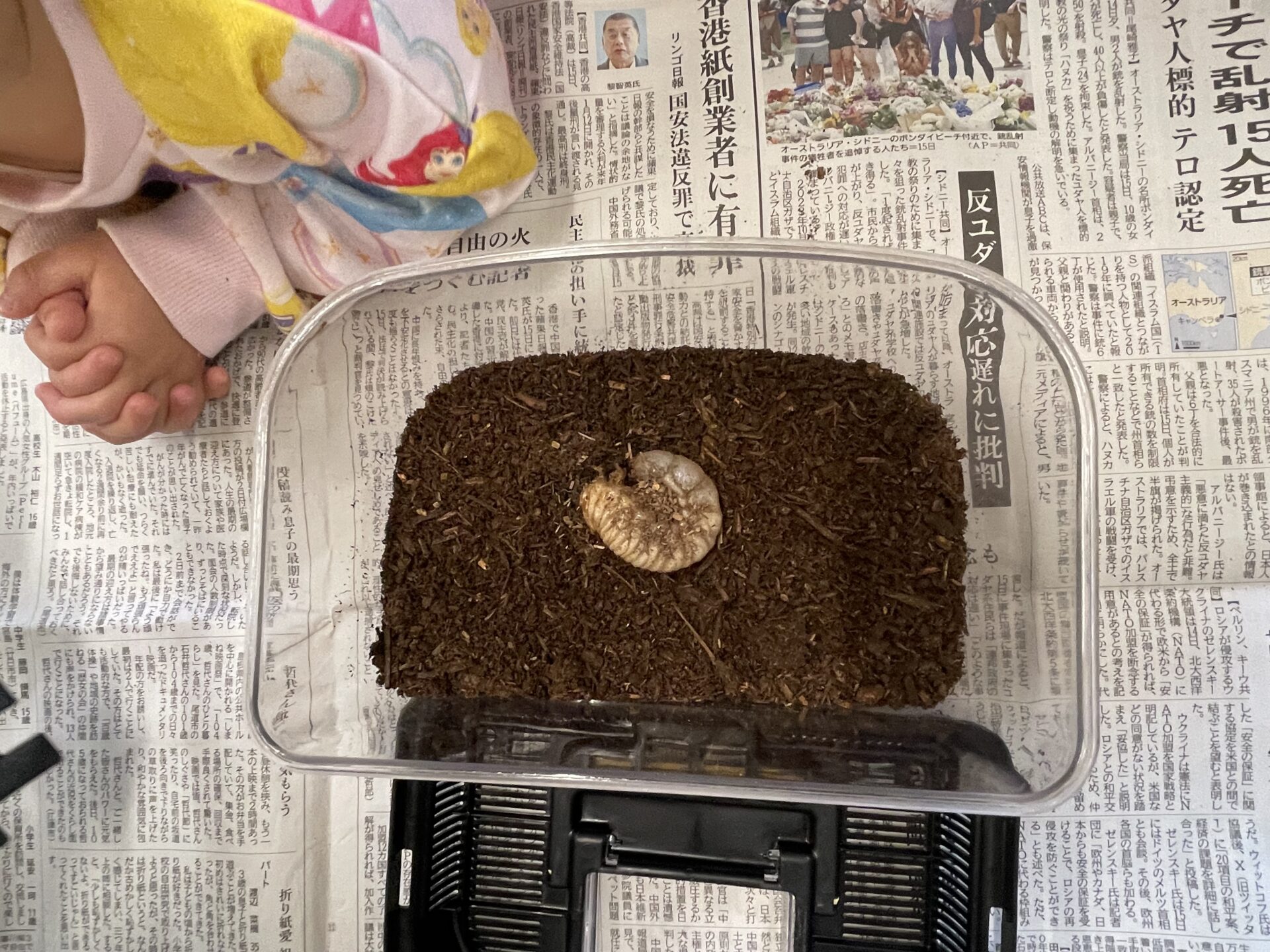 保育園で育てていたカブトムシから卵が生まれ、大きな幼虫に成長しました。