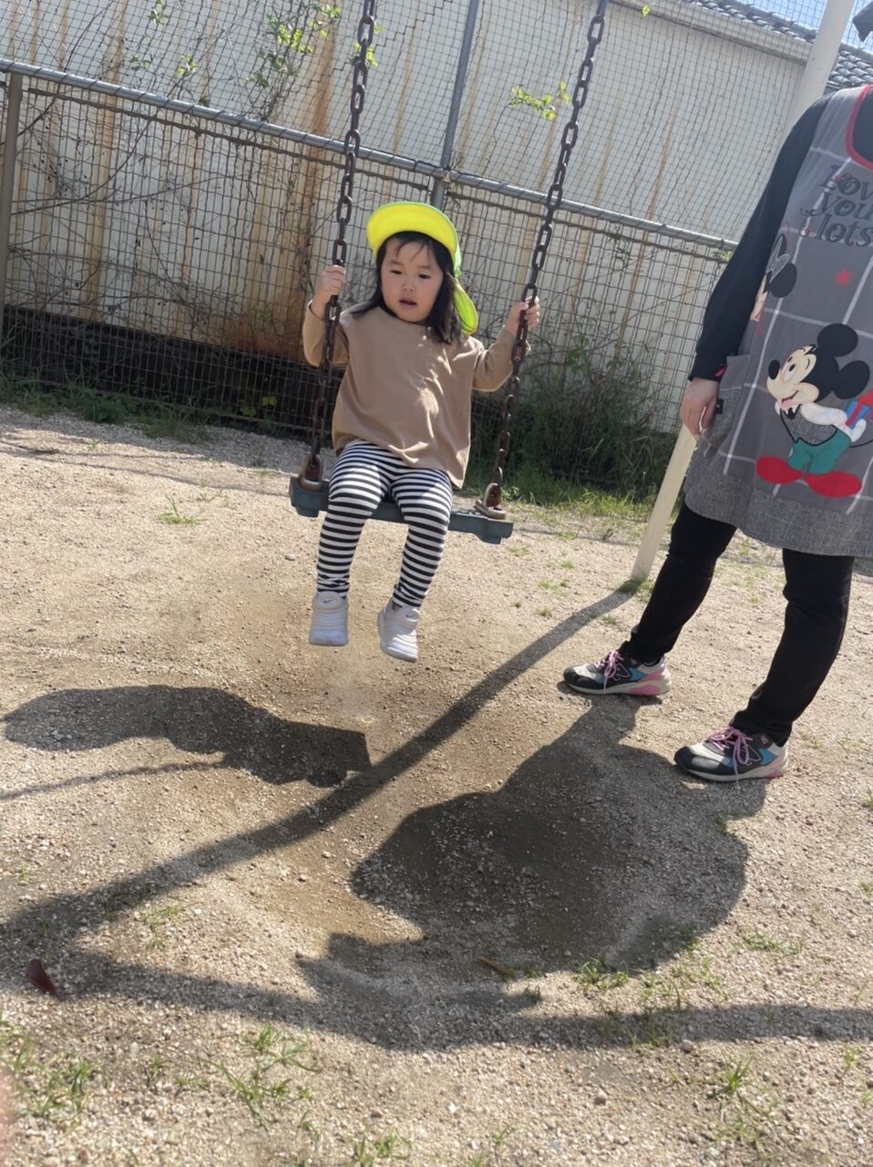 1人で乗ってみたり、保育士に支えてもらったりしてブランコに乗ったよ。♬