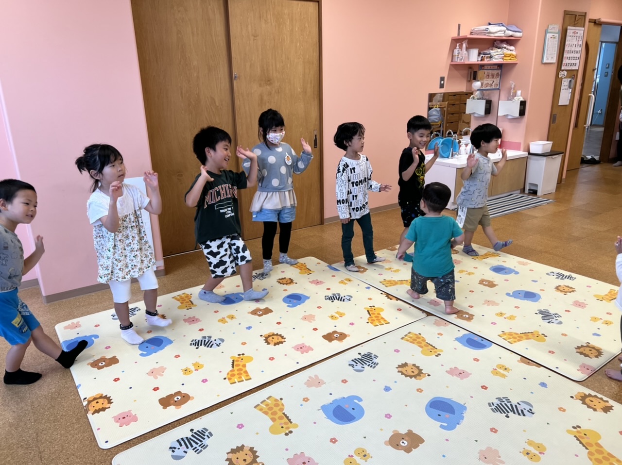 梅雨のある日、くじらチームさんが6月にある「大野みんなのまつり」のオープニングでダンスを披露する事になったので、だいちチームにダンスを教えてくれませんか?とお願いした所、快くOKを貰いました。今年初めて5歳児クラスのくじらチームとの交流が実現しました。