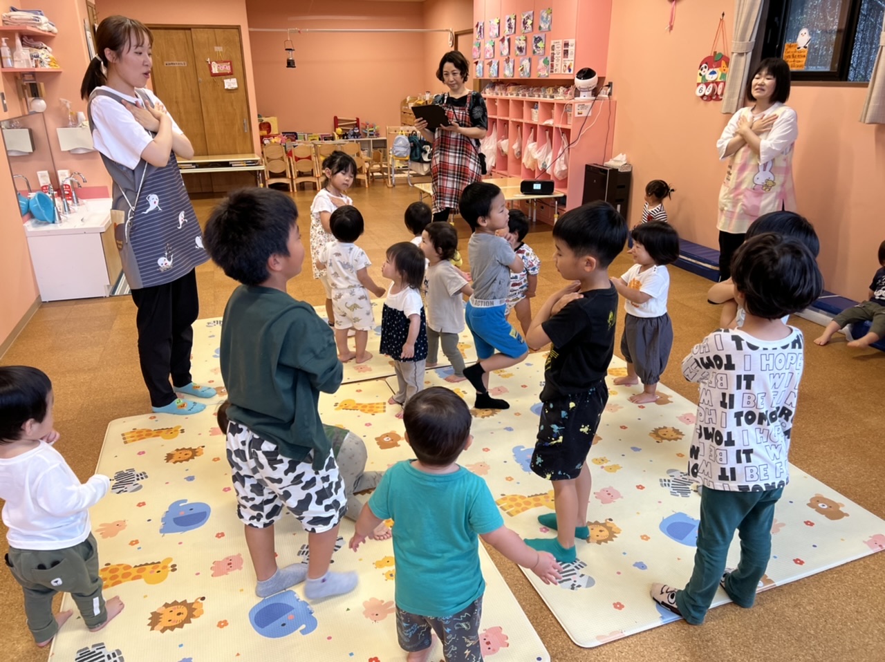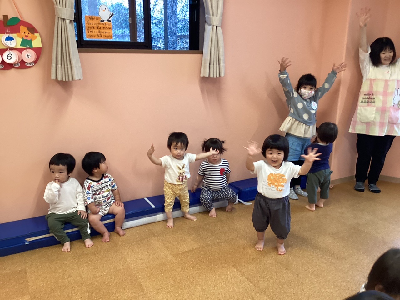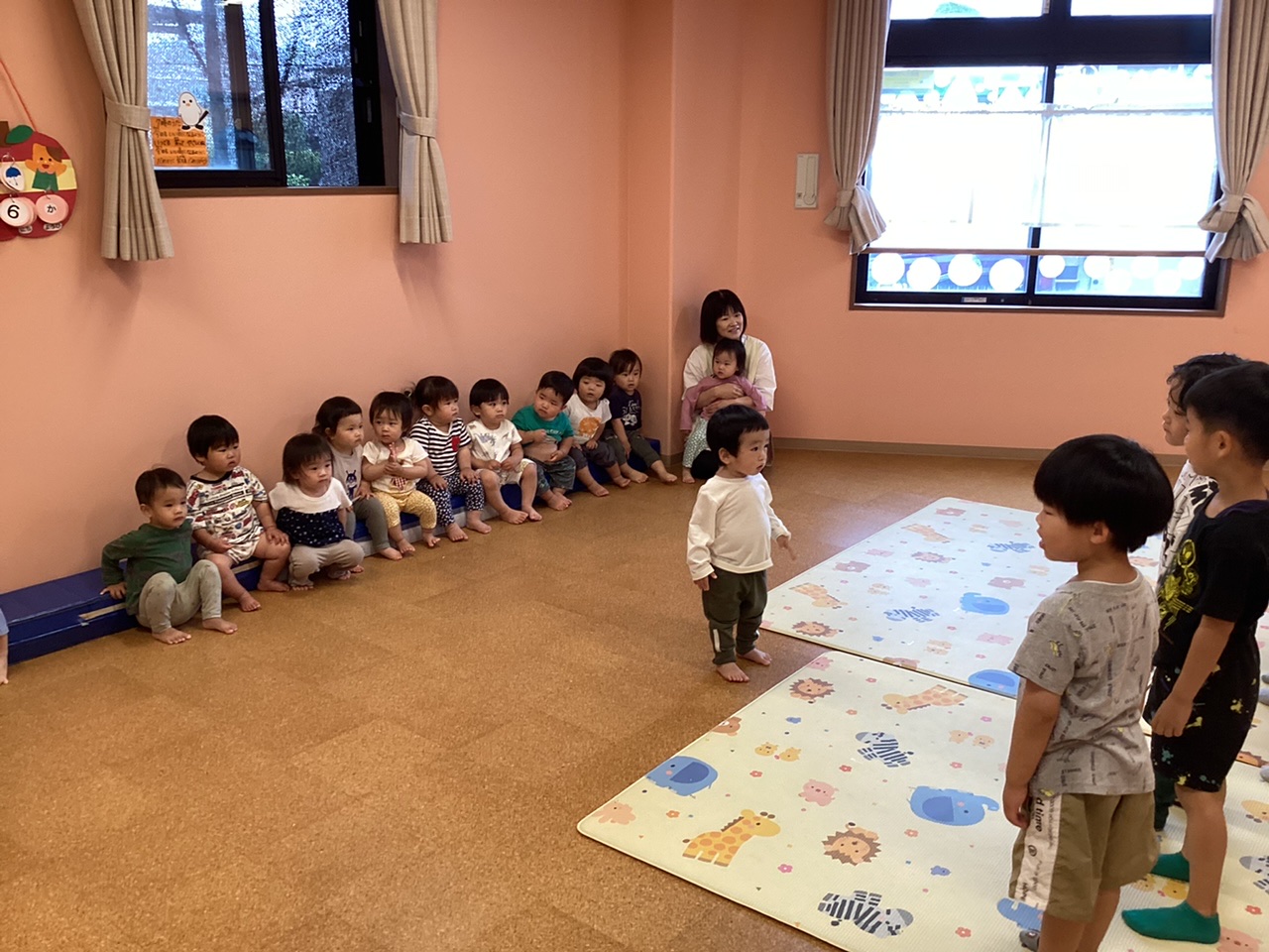突然、だいちチームのお部屋に入ってきたくじらチーム。初めての対面で、だいちチームの子どもたちは、何が始まるんだろう?と不思議そうな顔をしていましたが、最初に、だいちチームの得意な体操を見てもらうことにしました。