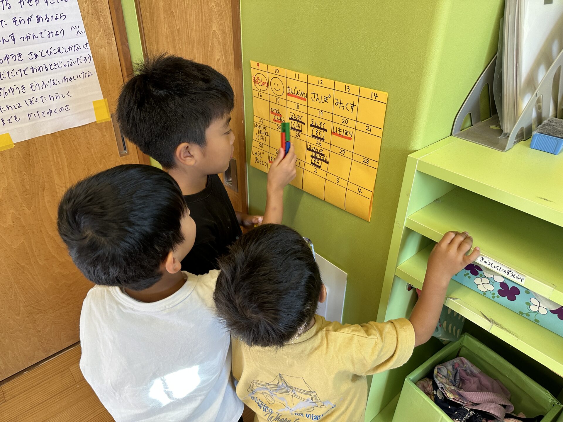 小学校進学に向けて自分で予定を把握、確認できるようになってほしいという思いから、そら・くじらチームの部屋の壁に行事予定を書いたカレンダーを貼ることにしました。
