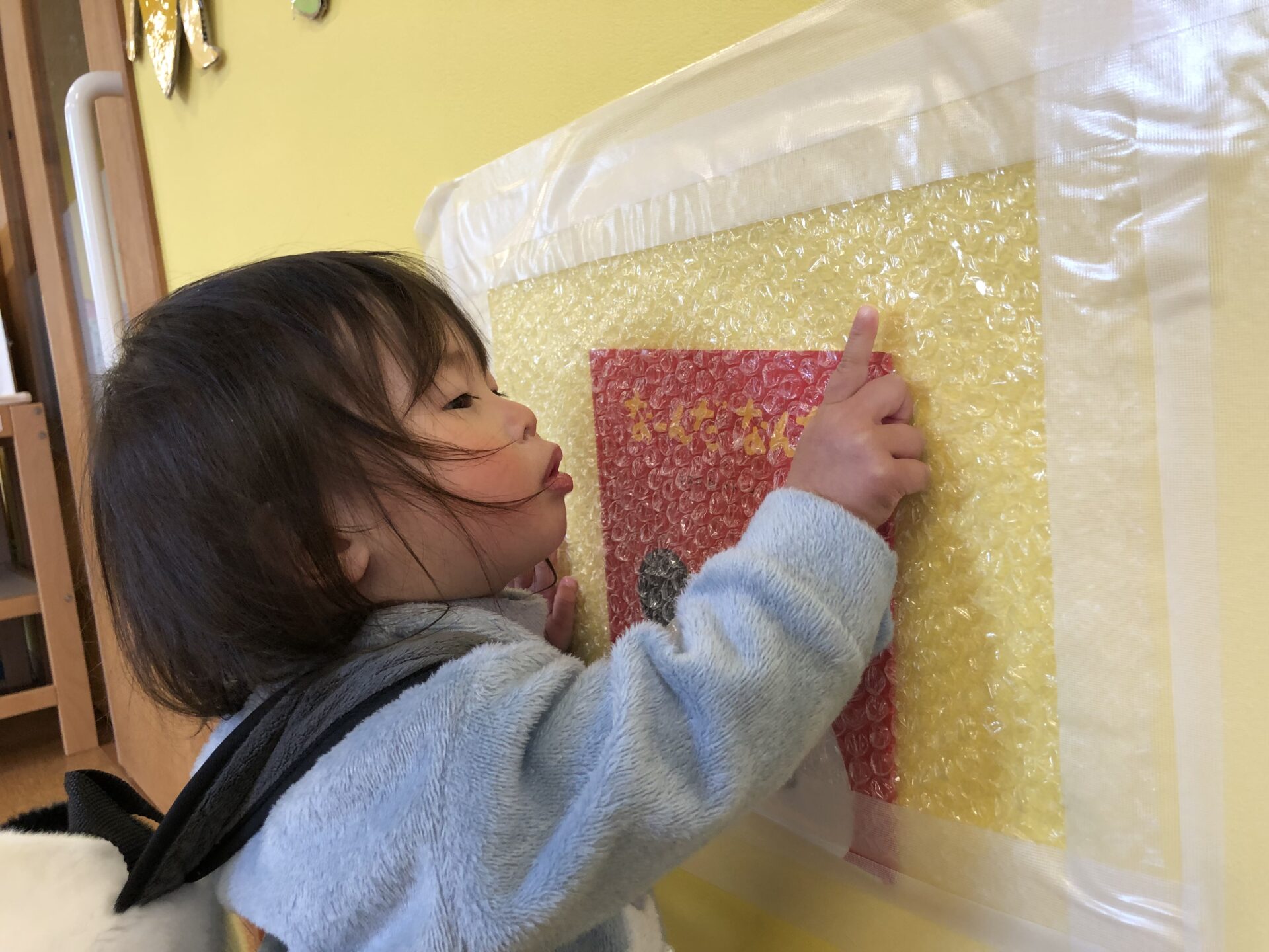 最初はどうにか壁から緩衝材を剥がそうととテープを触っていましたが、保育士がプチッと緩衝材を潰しているのを見て高月齢の子たちが「おもしろそう!」と真似っこを始めました!まだ潰すことは難しいですが、プチプチの一粒一粒を指で押して感触を楽しんでいるようです。