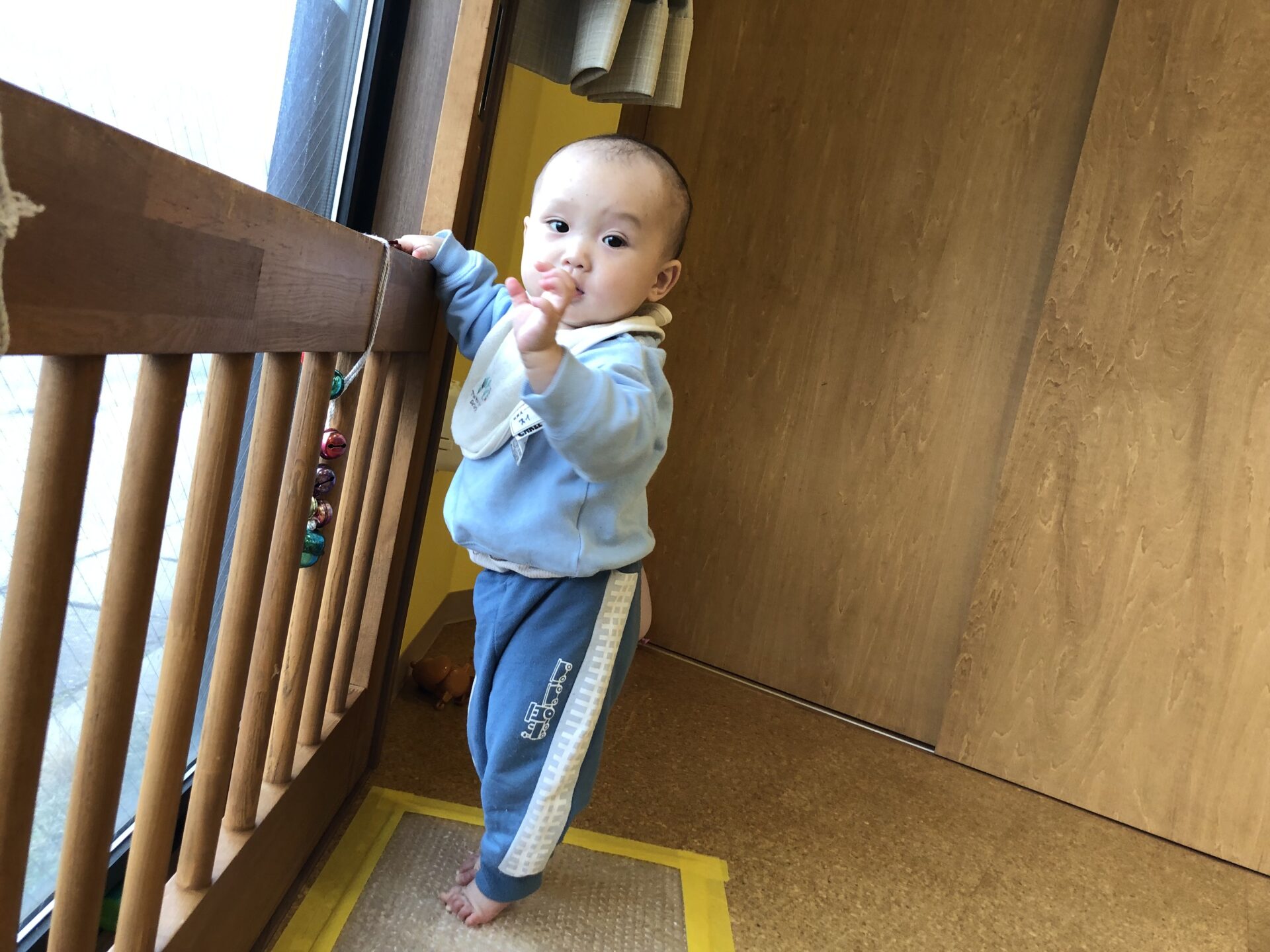 低月齢の子どもたちは、緩衝材と壁の中に入れた表紙を触ろうとして緩衝材に手が触れ、「あれ?なんだか不思議な感触😳」と不思議そうな表情をしています。「なんだろう?」とまじまじと緩衝材を眺めている姿はとても可愛いです!