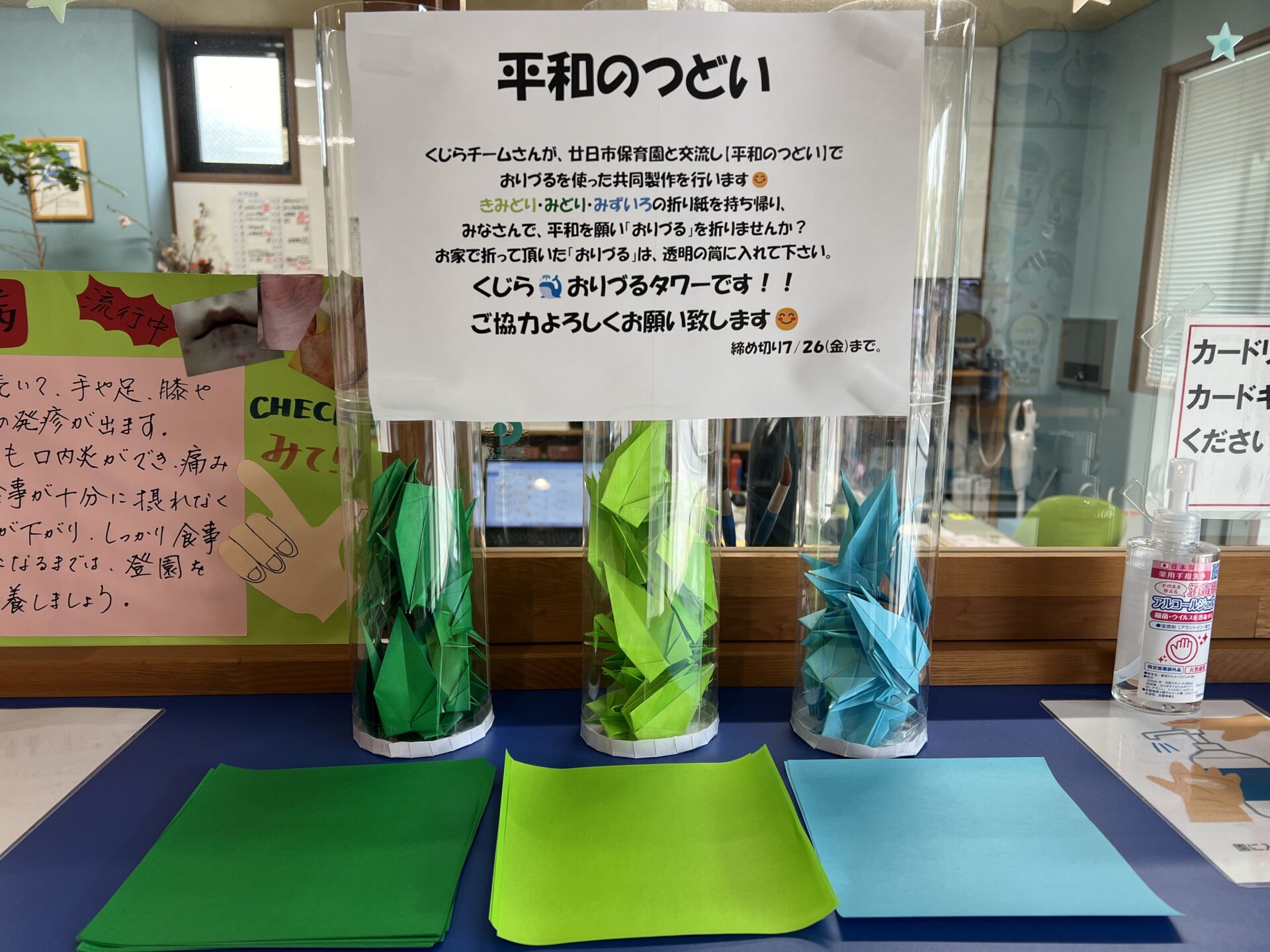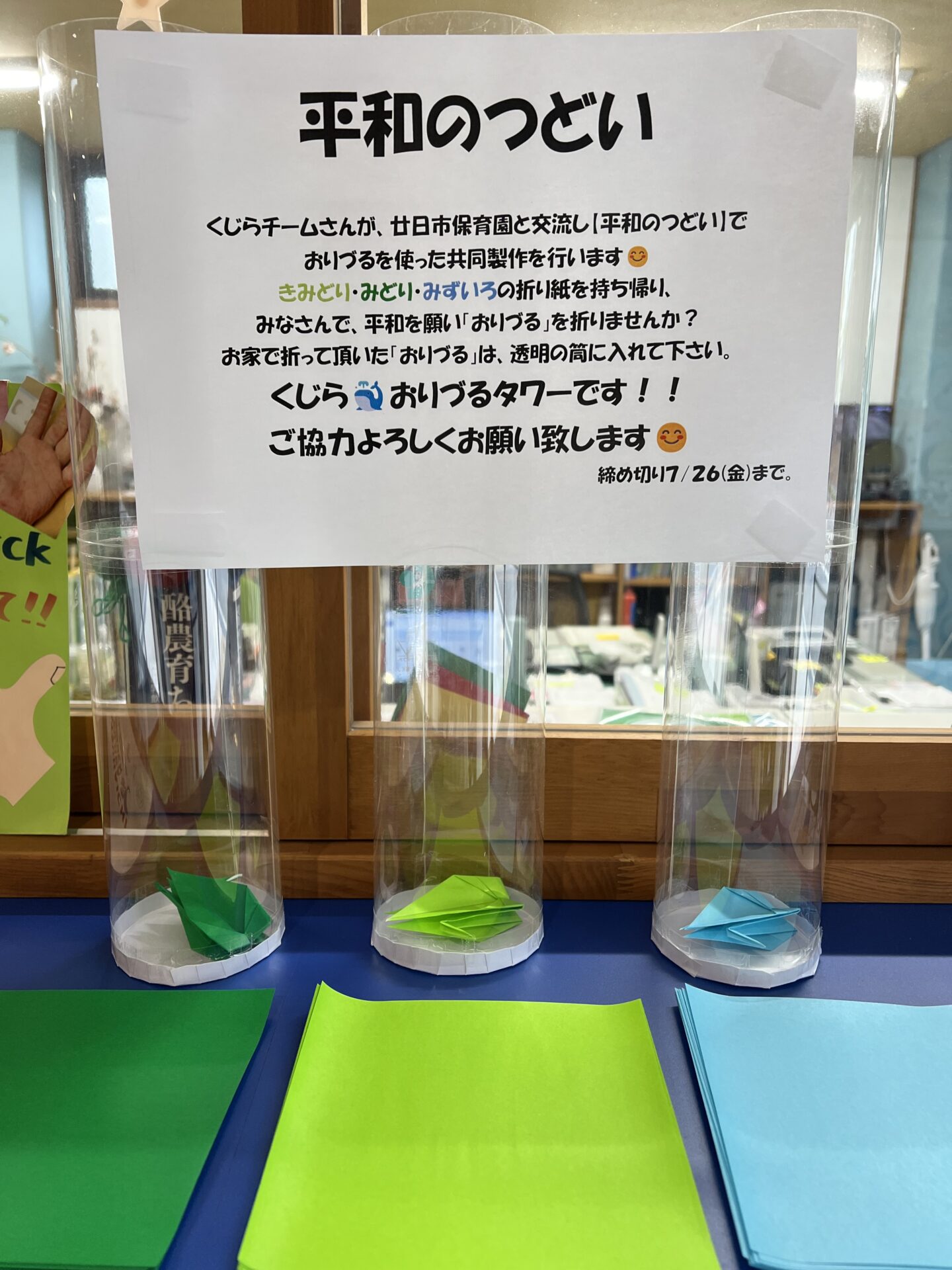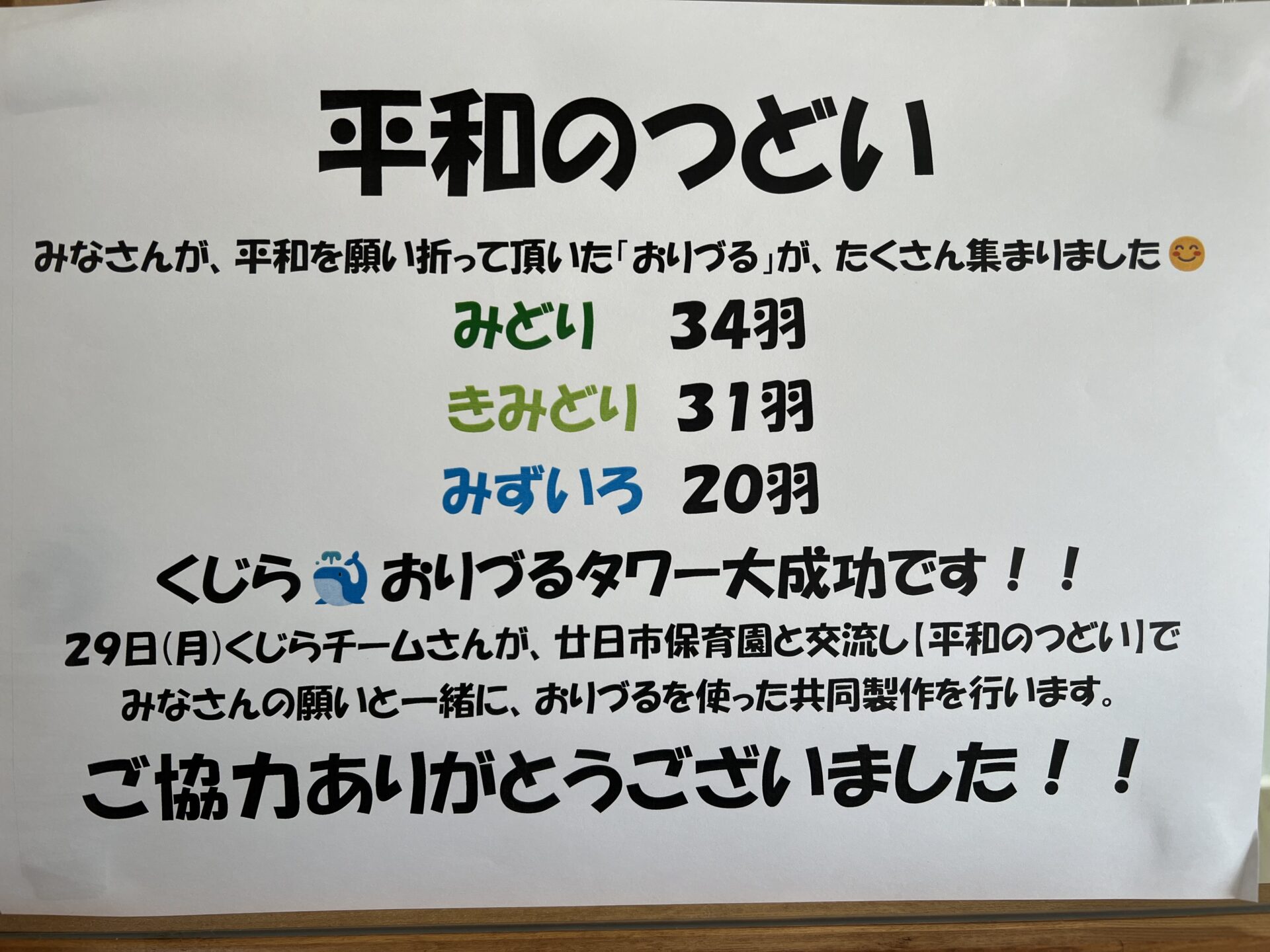 数日経ったある日、【くじら🐳おりづるタワー】をのぞいてみると、少しずつ平和の願いと共に「おりづる」が集まっていました。みなさんが協力して下さっていることが分かり、とても温かい気持ちになりました😊