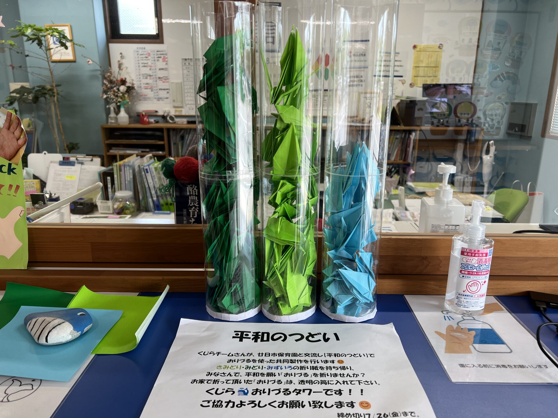そこで、7月某所、事務所の前に【くじら🐳おりづるタワー】を設置することにしました。