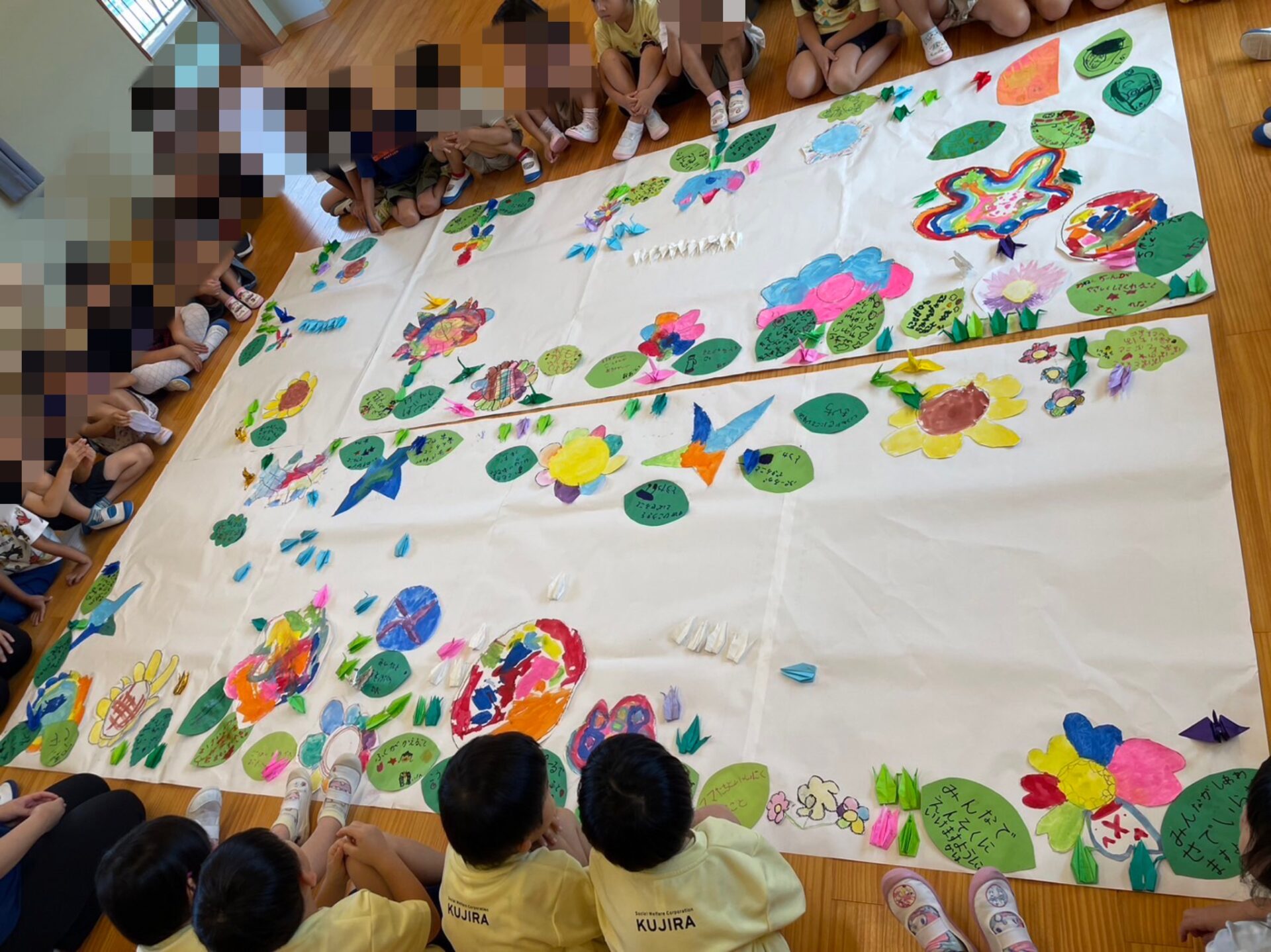 くじらチームさんが、このたくさん集まった「おりづる」を廿日市保育園に持っていき一緒にひとつの作品を作りました。出来上がった作品を見て、廿日市くじら保育園のくじらチームのO先生は、子ども達に「どうして、みんなの描いた花が色んな方向に咲いてると思う?」