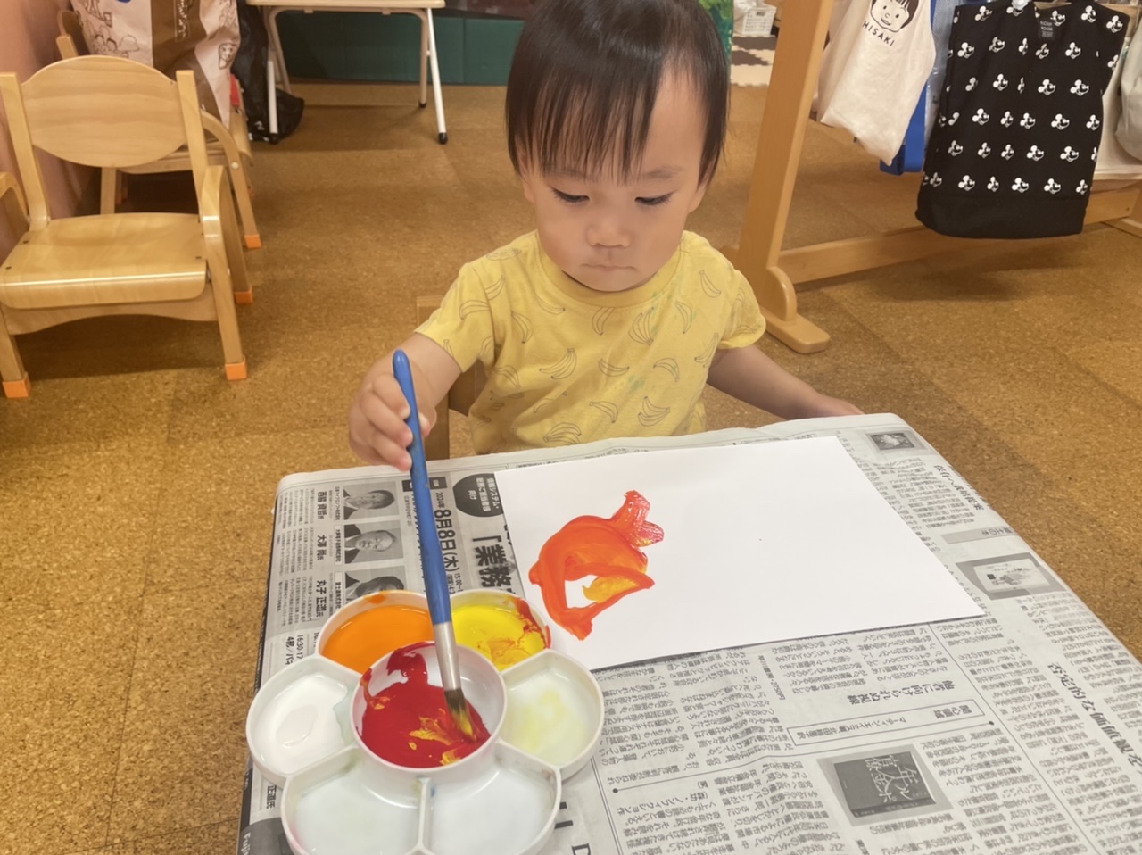絵の具遊びも何回か経験していたので、筆を渡すとすぐにパレットで絵の具をつけて