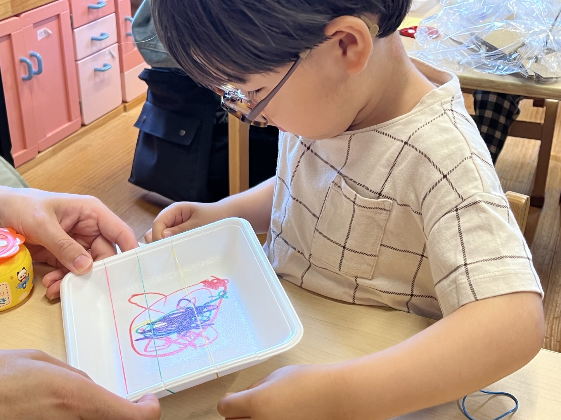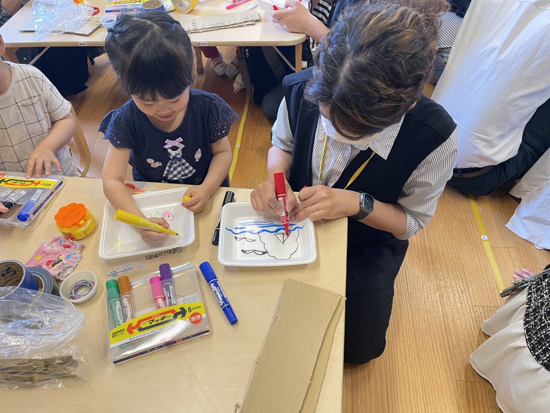 まずは、食品トレーにマジックで絵柄をつけていきます😊保護者の方の方が、真剣に取り組んでいらっしゃいました(笑)とっても絵がお上手な、お父さん・お母さんが多かったです👍✨