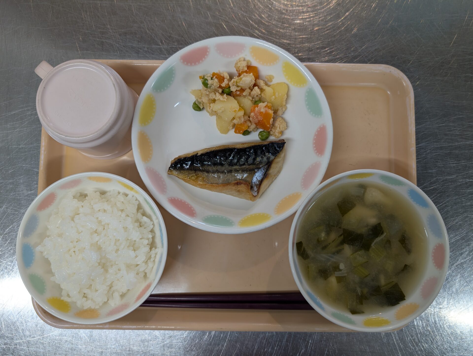 今日のメニューは、ご飯、さばの塩焼き、じゃがいものそぼろ煮、小松菜の味噌汁です。